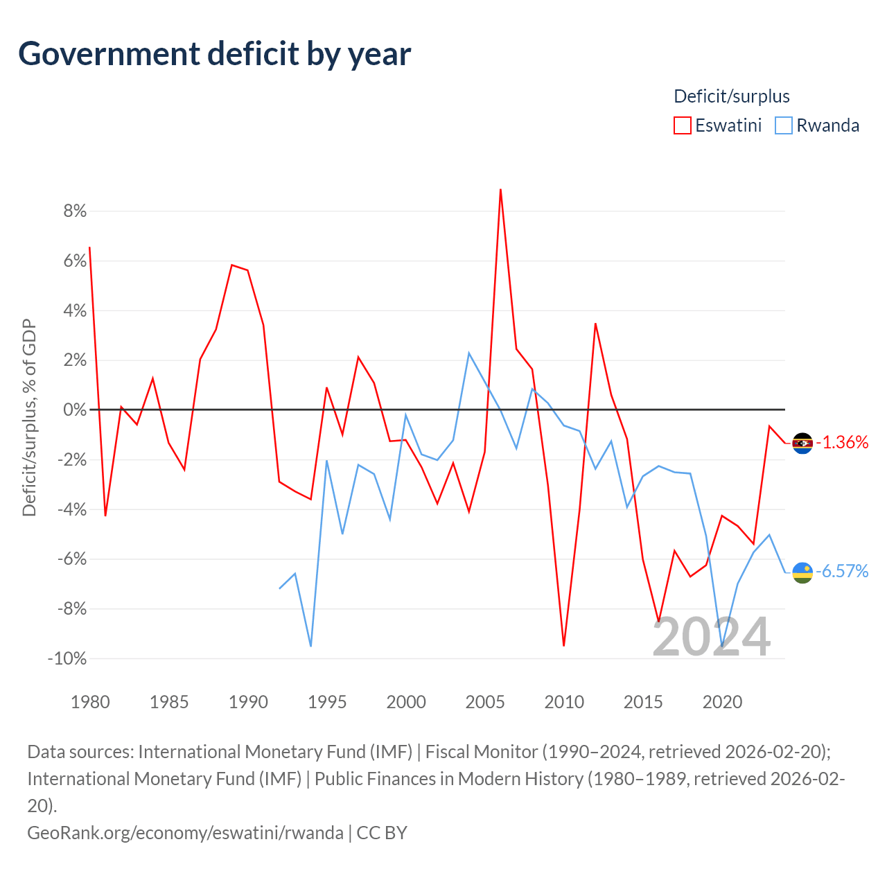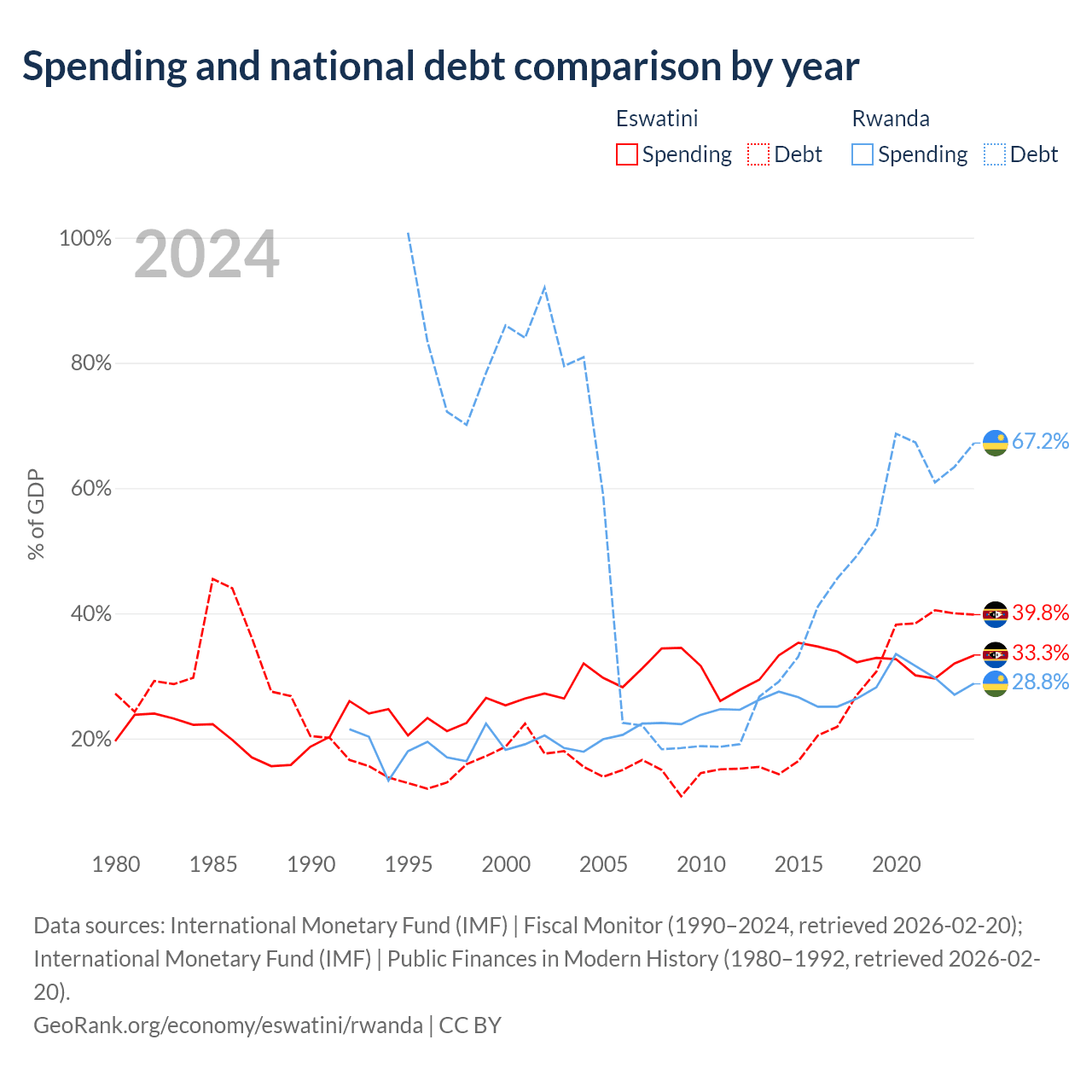 Eswatini has $1.93B in government debt (39.8% of GDP), compared to $9.58B (67.2% of GDP) in Rwanda.
