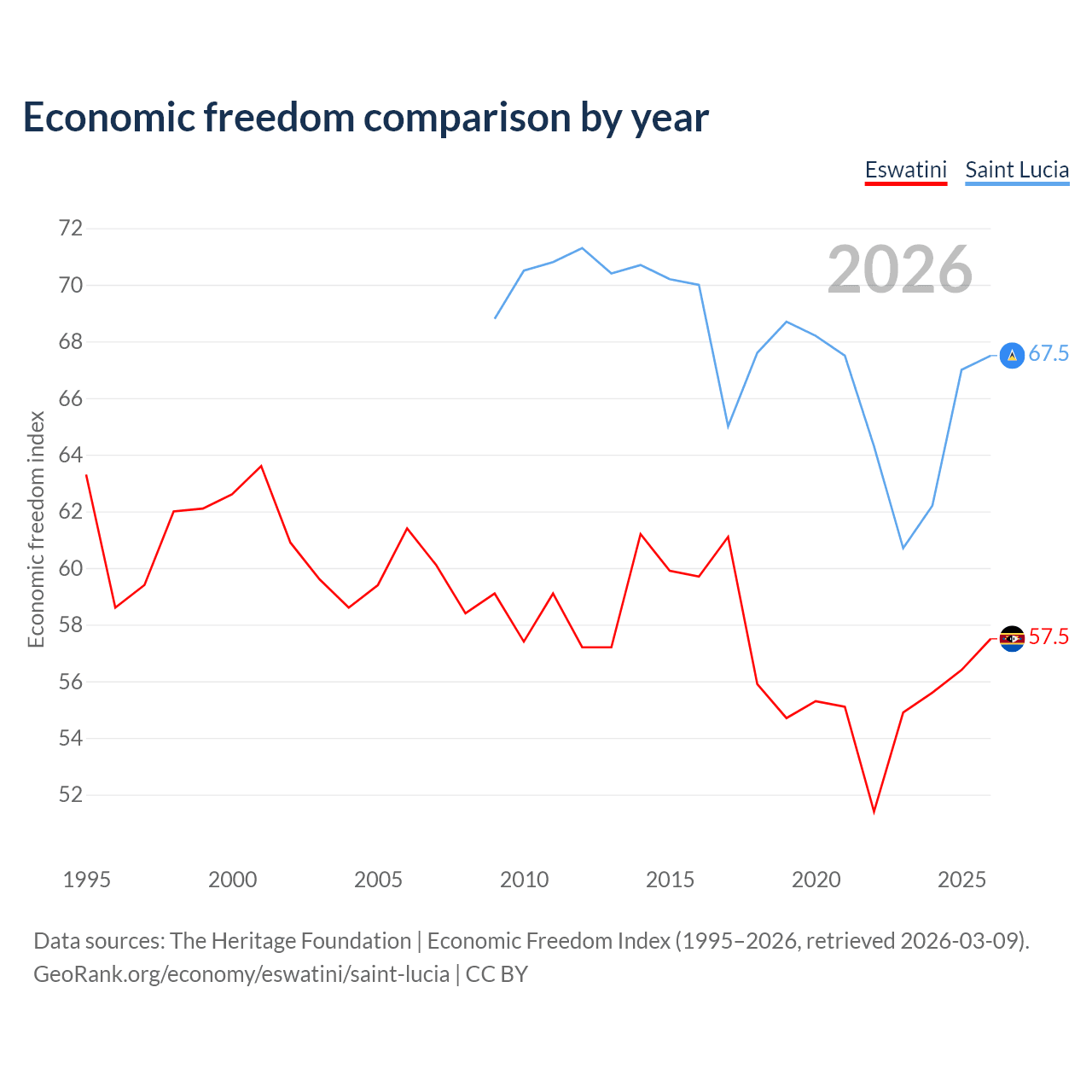 The Economic Freedom Index for Eswatini is 57.5, ranking 116/197, compared to 67.5 for Saint Lucia, ranking 57/197. The chart above displays a comparison of annual changes in economic freedom indexes.