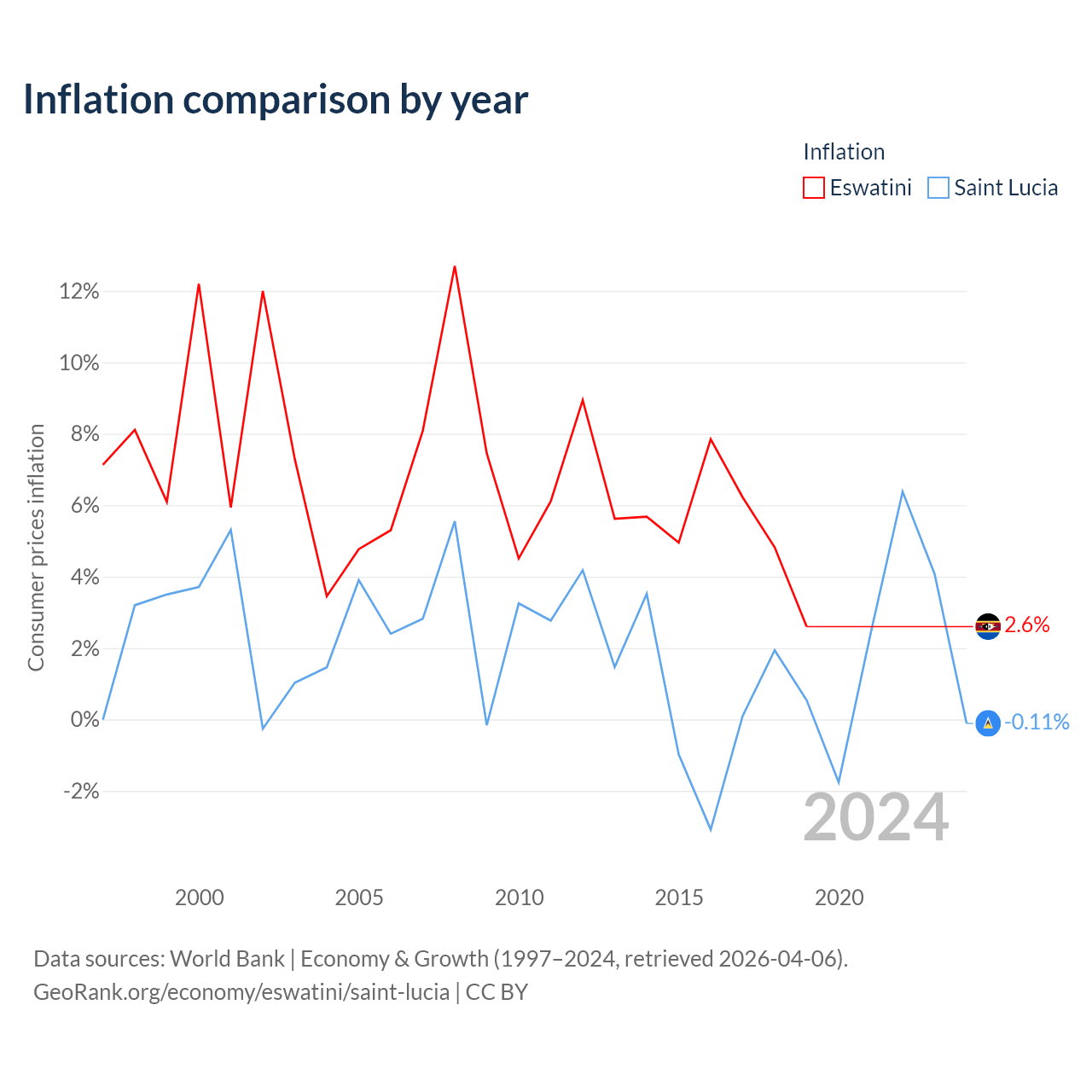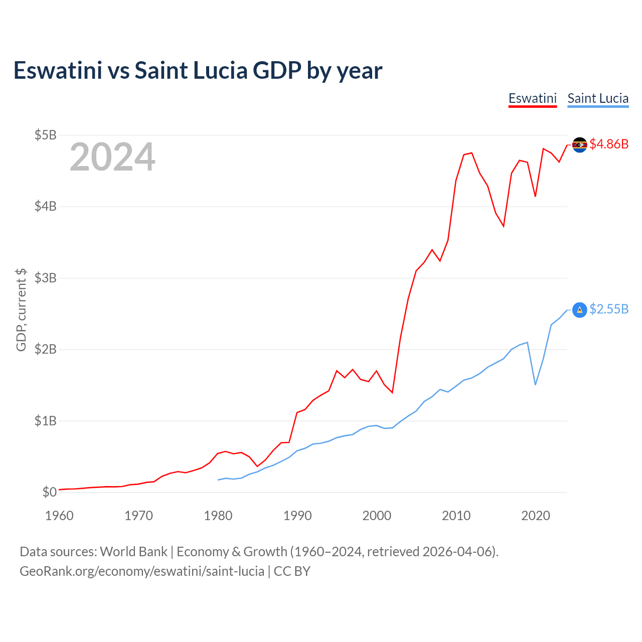 Eswatini has a GDP of $4.86B compared to $2.55B for Saint Lucia, ranking 162/197 and 173/197 by economy size, respectively.