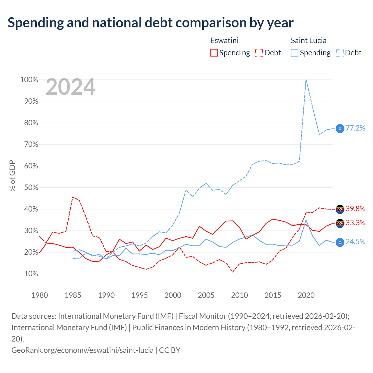 Eswatini has $1.93B in government debt (39.8% of GDP), compared to $1.97B (77.2% of GDP) in Saint Lucia.
