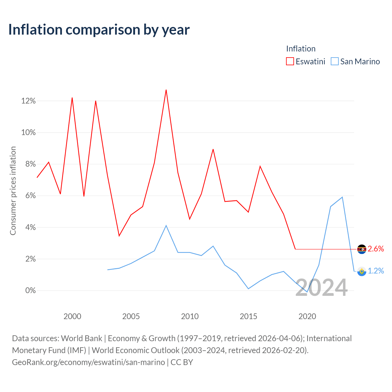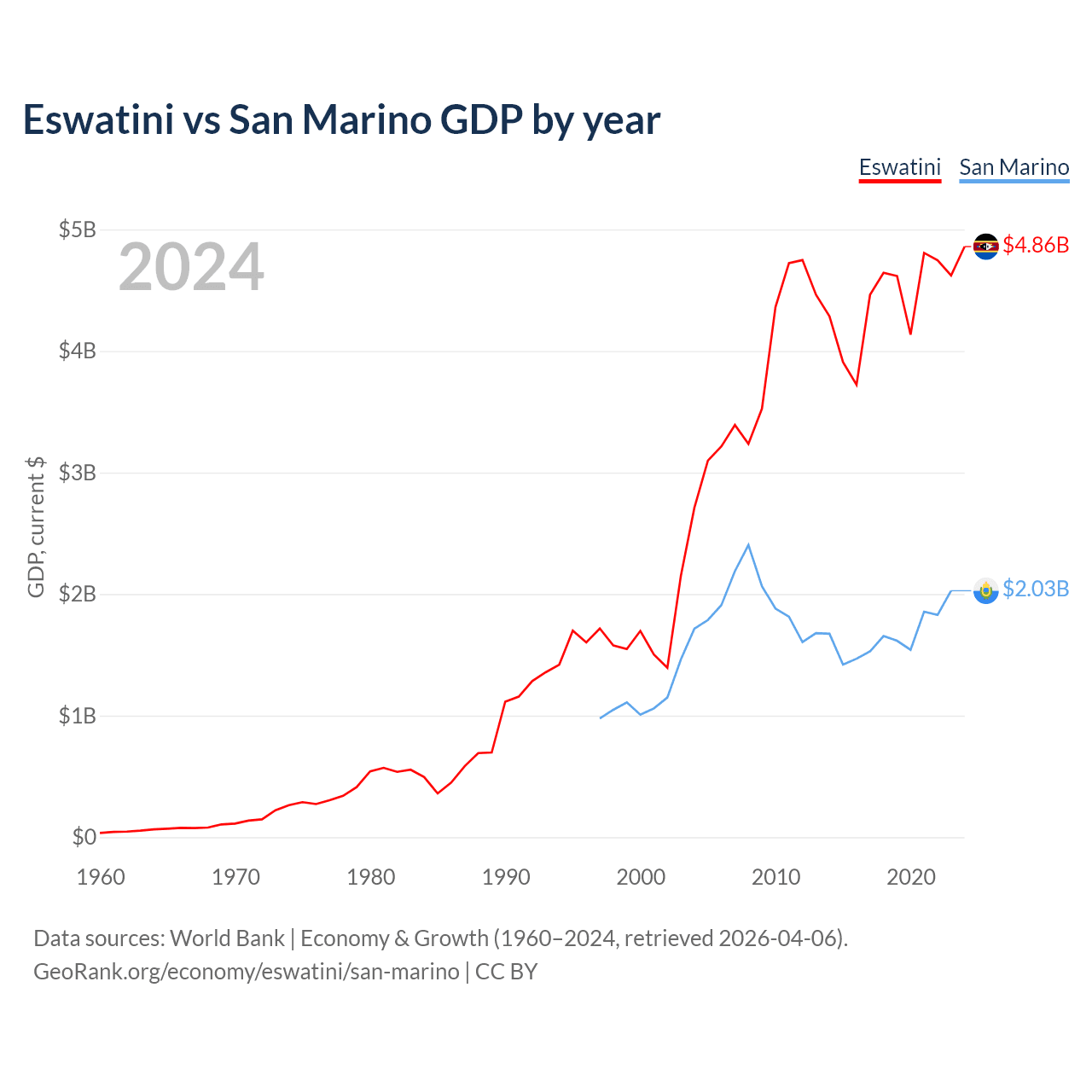 Eswatini has a GDP of $4.86B compared to $2.03B for San Marino, ranking 162/197 and 180/197 by economy size, respectively.