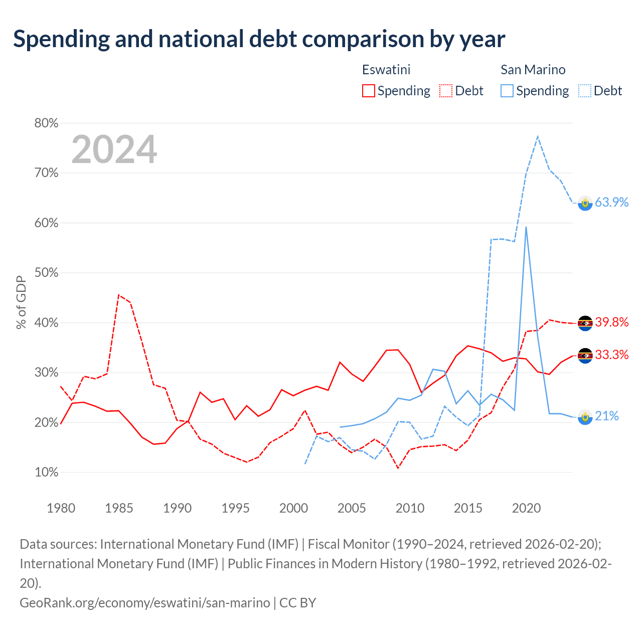 Eswatini has $1.93B in government debt (39.8% of GDP), compared to $1.39B (63.9% of GDP) in San Marino.
