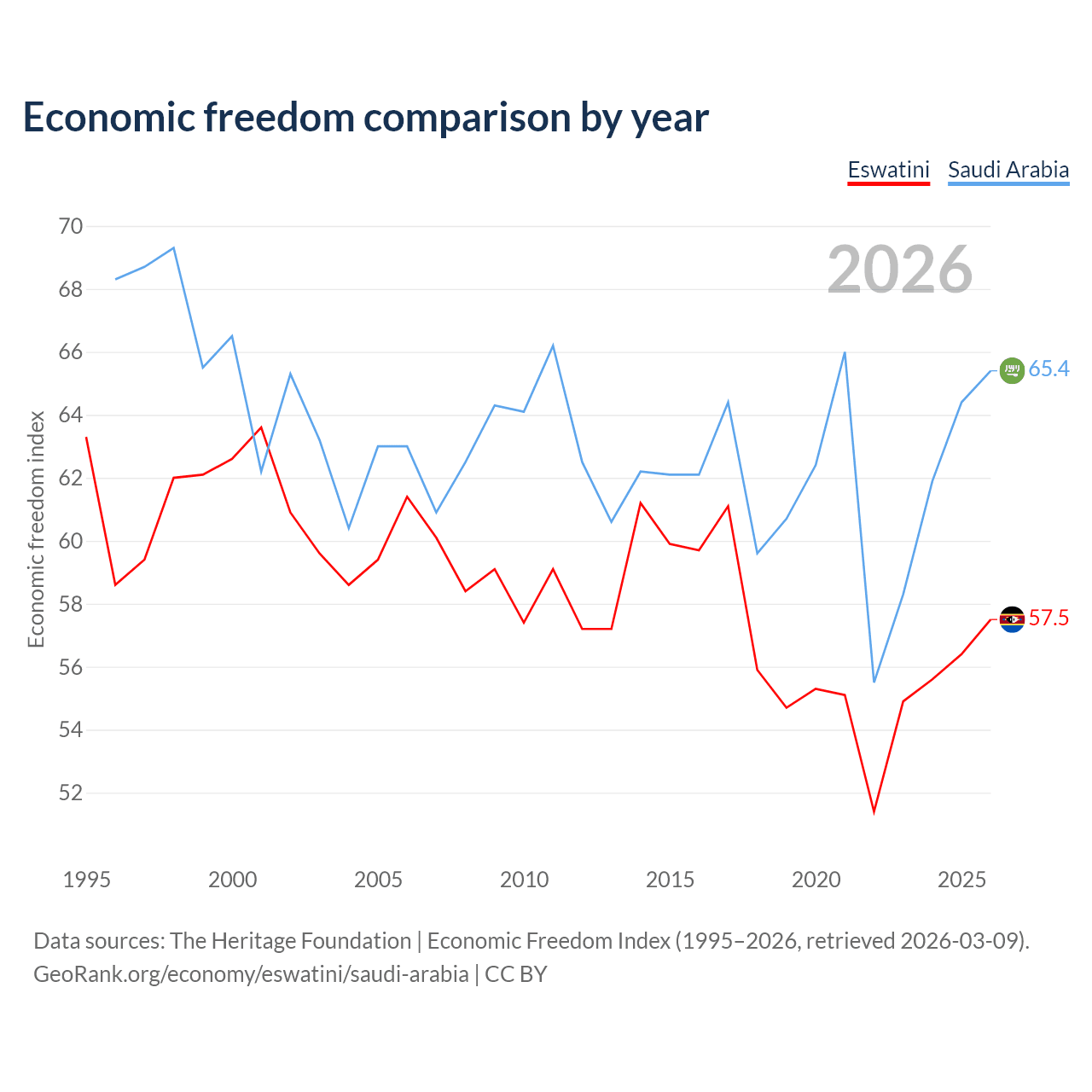The Economic Freedom Index for Eswatini is 57.5, ranking 116/197, compared to 65.4 for Saudi Arabia, ranking 65/197. The chart above displays a comparison of annual changes in economic freedom indexes.
