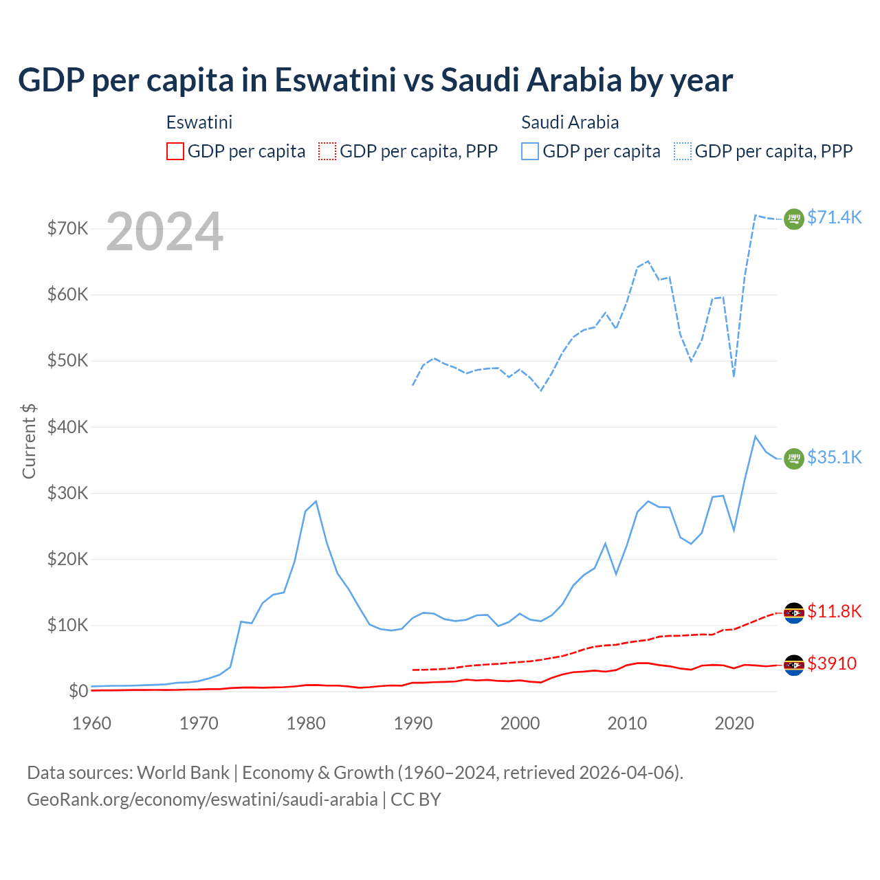 GDP per capita in Eswatini vs Saudi Arabia by year