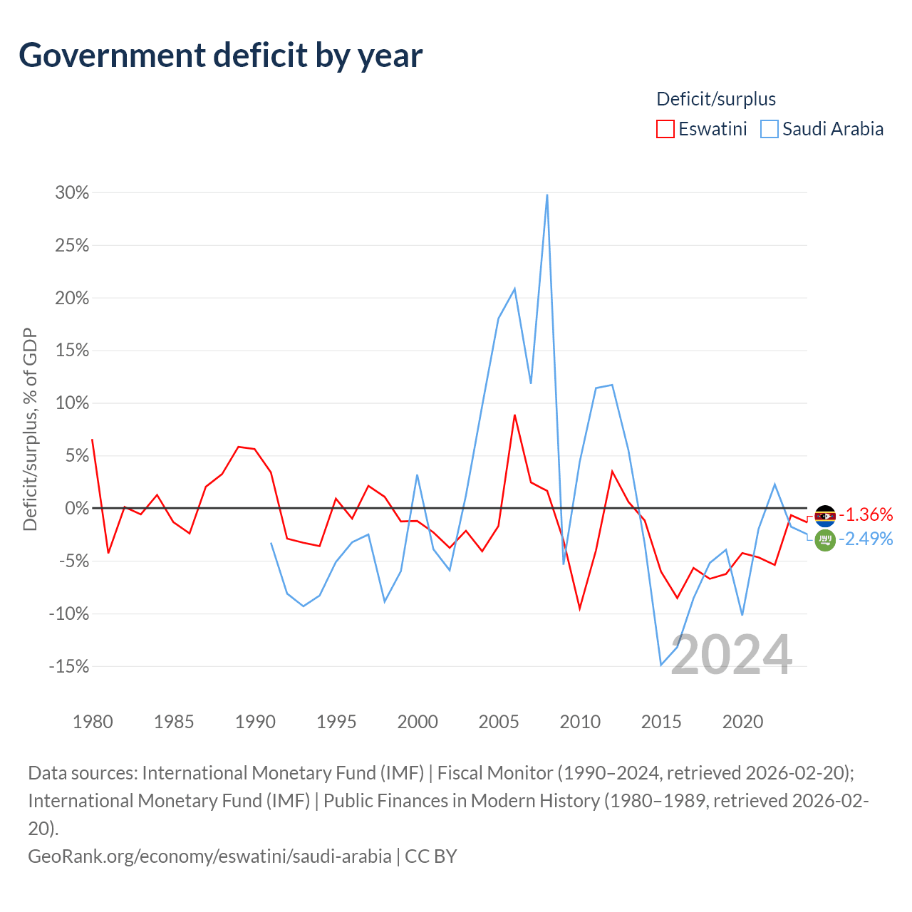 Eswatini has a GDP of $4.86B compared to $1.24T for Saudi Arabia, ranking 162/197 and 18/197 by economy size, respectively.