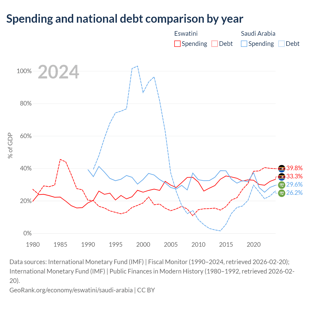 Eswatini has $1.93B in government debt (39.8% of GDP), compared to $324B (26.2% of GDP) in Saudi Arabia.