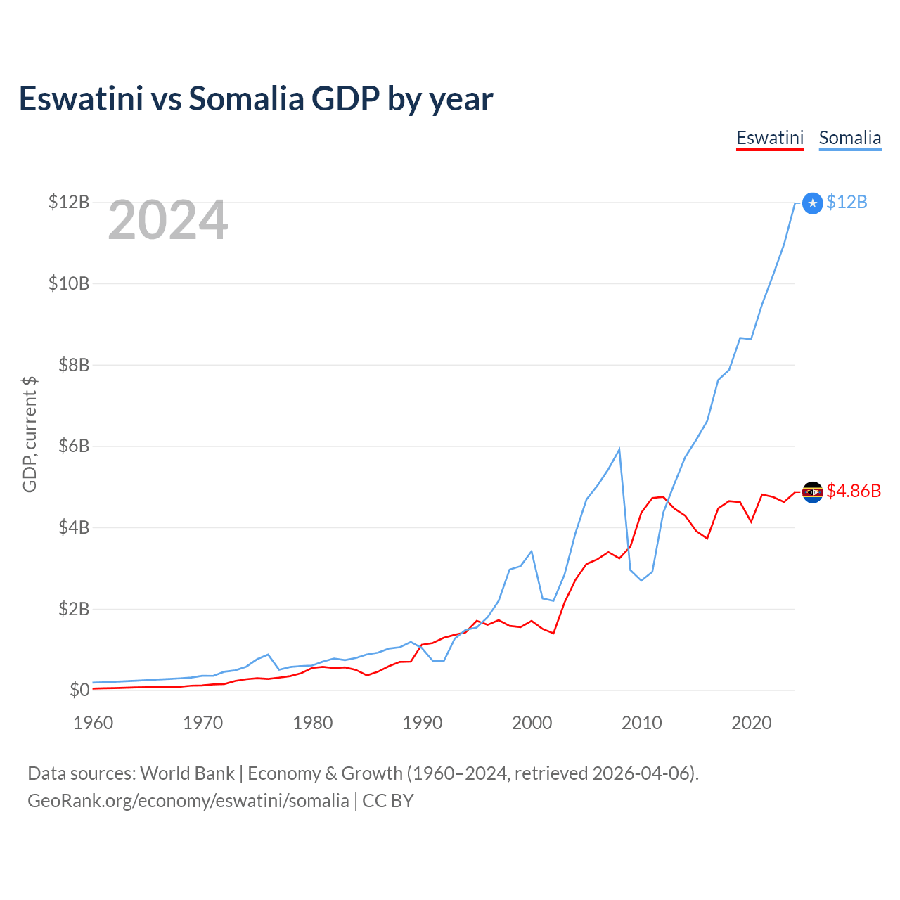 Eswatini has a GDP of $4.86B compared to $12B for Somalia, ranking 162/197 and 150/197 by economy size, respectively.