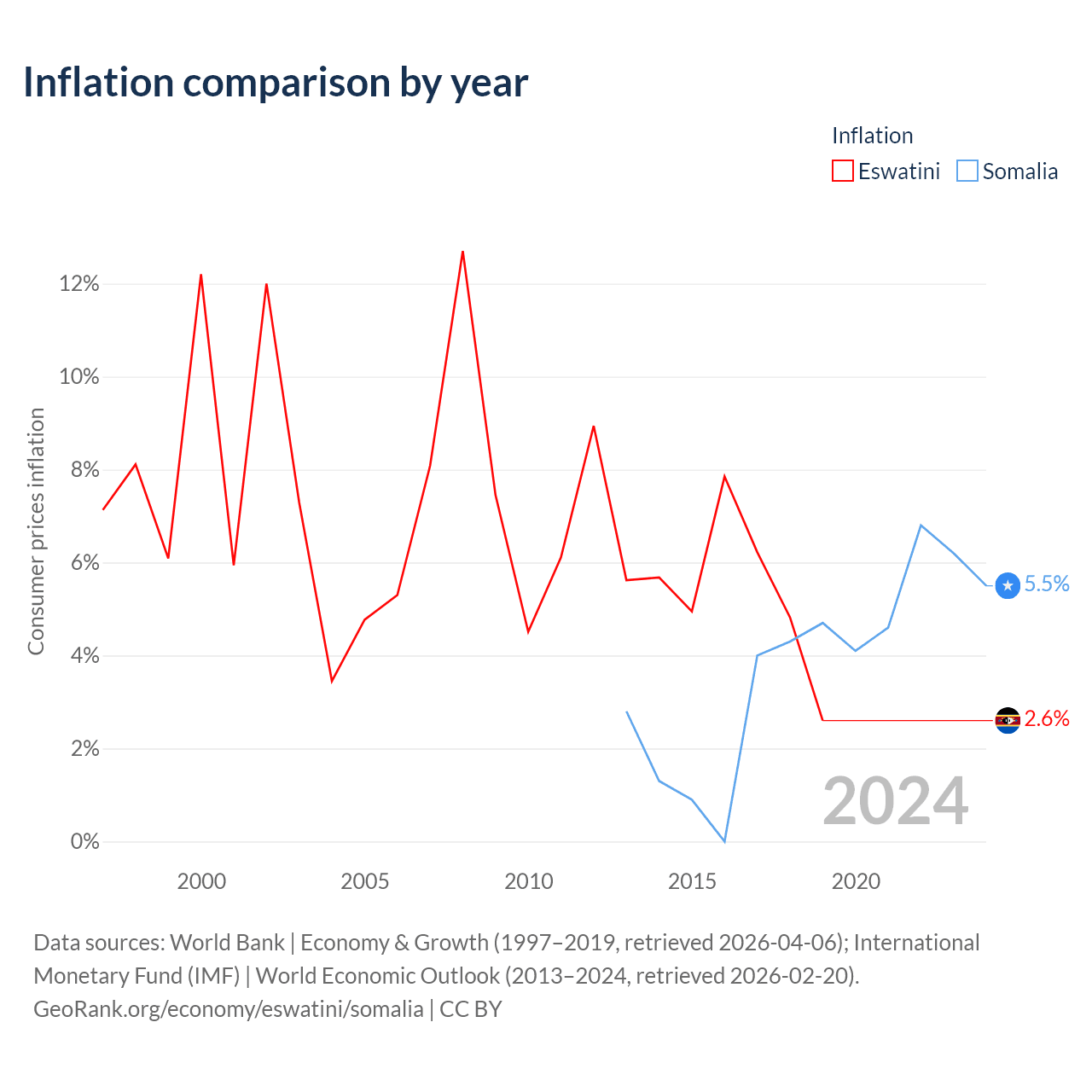 Over the past 7 years, Eswatini has recorded an average annual inflation rate of 5.39%, compared with 2.57% in Somalia. In 2019, inflation was 2.6% in Eswatini and 5.5% in Somalia.