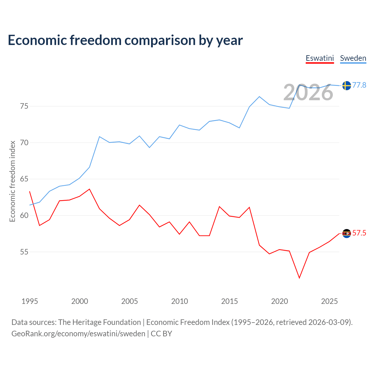 The Economic Freedom Index for Eswatini is 57.5, ranking 116/197, compared to 77.8 for Sweden, ranking 14/197. The chart above displays a comparison of annual changes in economic freedom indexes.