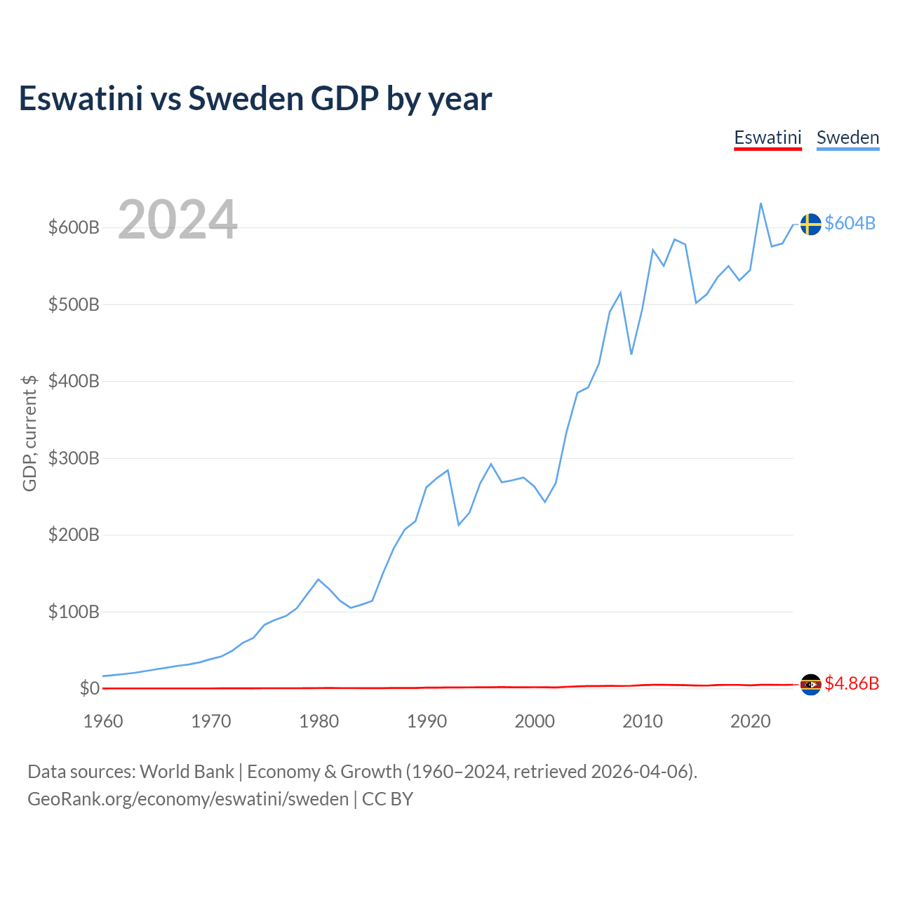 Eswatini has a GDP of $4.86B compared to $604B for Sweden, ranking 162/197 and 26/197 by economy size, respectively.