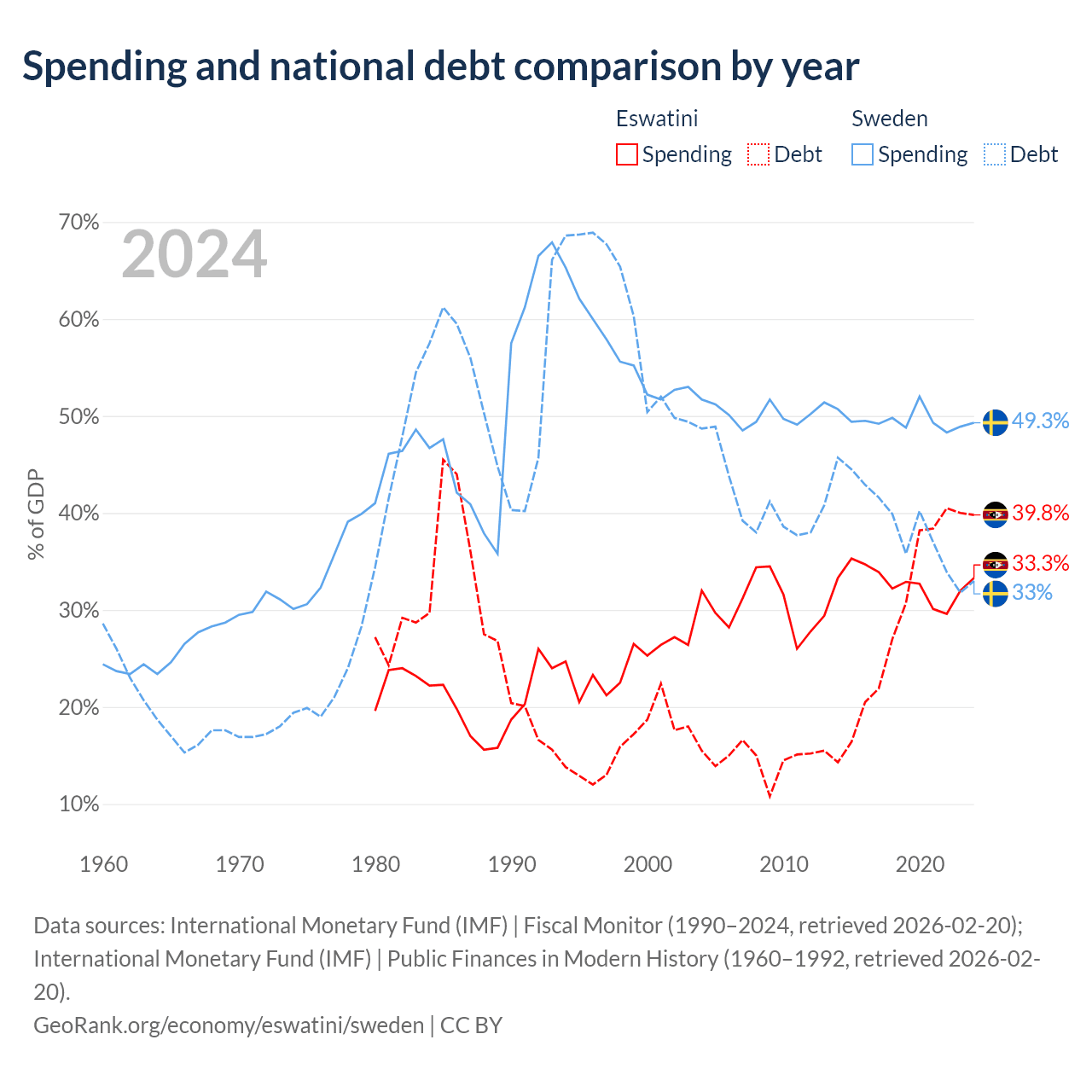 Eswatini has $1.93B in government debt (39.8% of GDP), compared to $199B (33% of GDP) in Sweden.