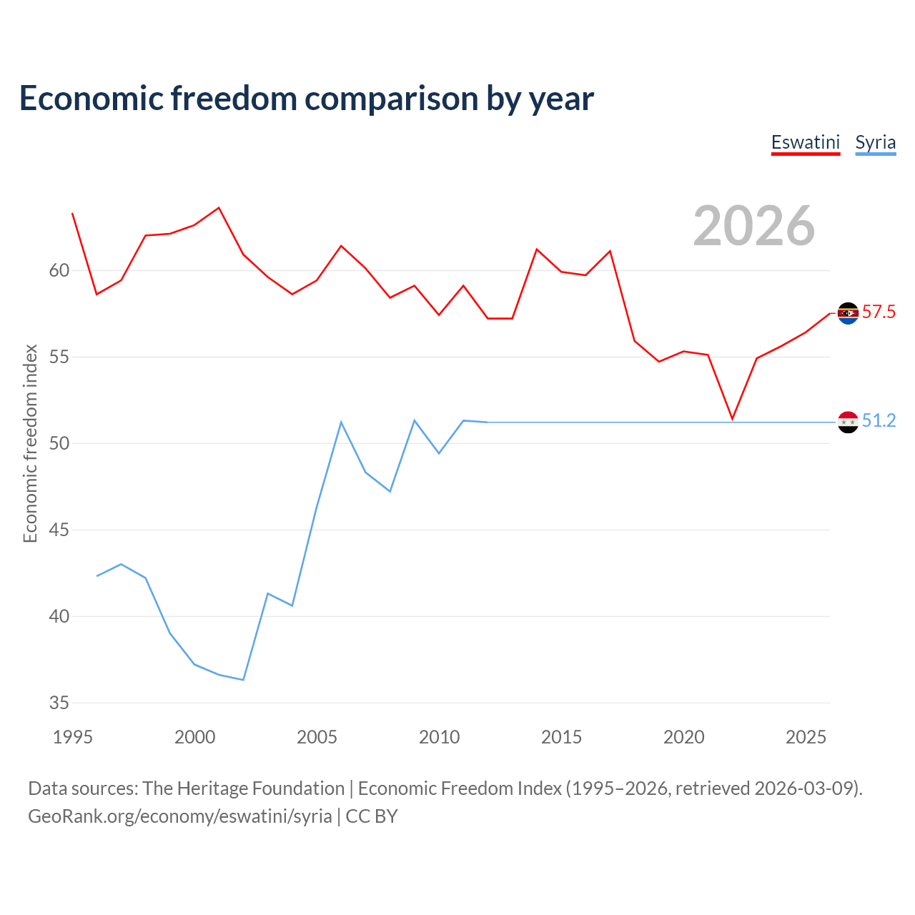 The Economic Freedom Index for Eswatini is 57.5, ranking 116/197, compared to 51.2 for Syria, ranking 155/197. The chart above displays a comparison of annual changes in economic freedom indexes.