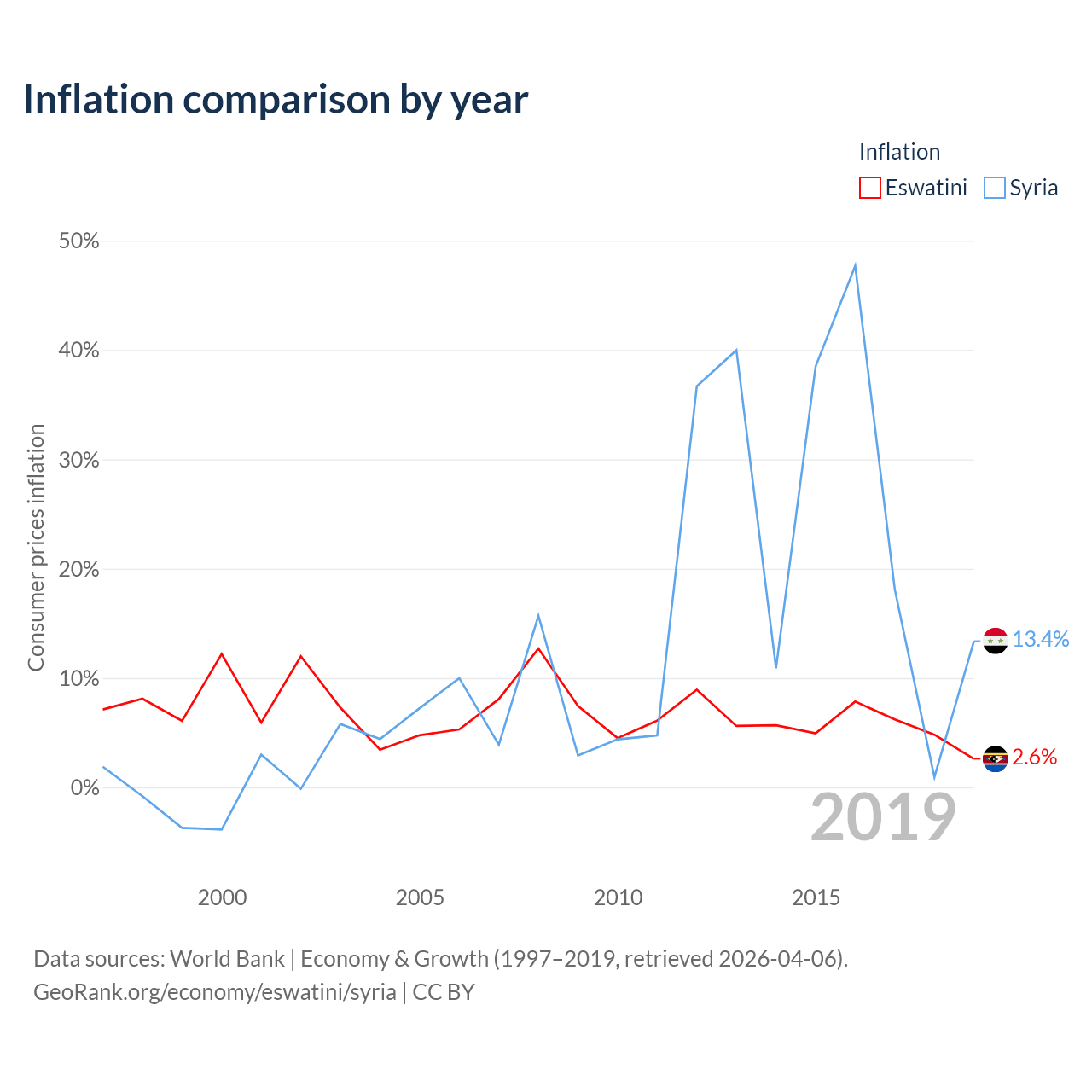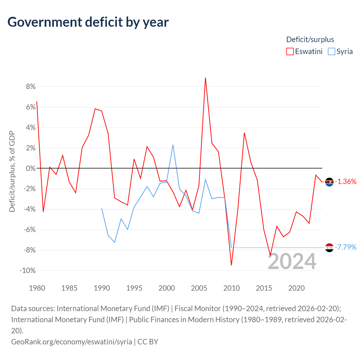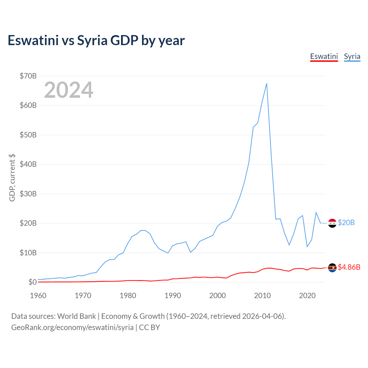 Eswatini has a GDP of $4.86B compared to $20B for Syria, ranking 162/197 and 129/197 by economy size, respectively.
