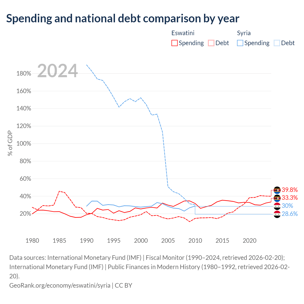 Eswatini has $1.93B in government debt (39.8% of GDP), compared to $18.4B (30% of GDP) in Syria.