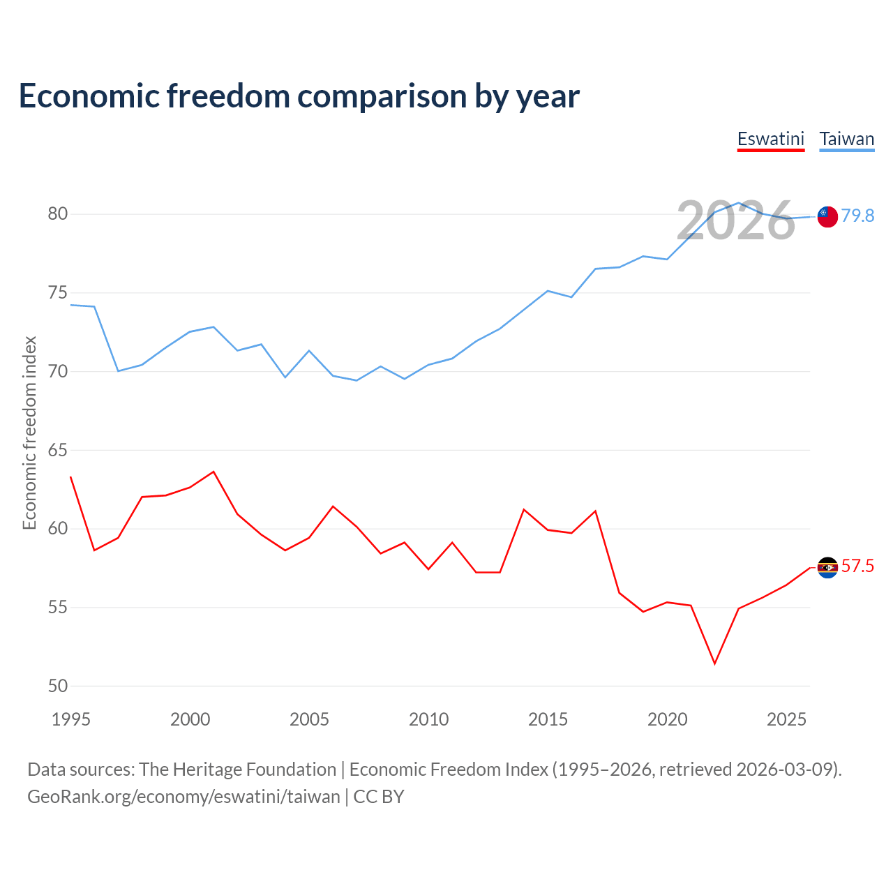 The Economic Freedom Index for Eswatini is 57.5, ranking 116/197, compared to 79.8 for Taiwan, ranking 6/197. The chart above displays a comparison of annual changes in economic freedom indexes.
