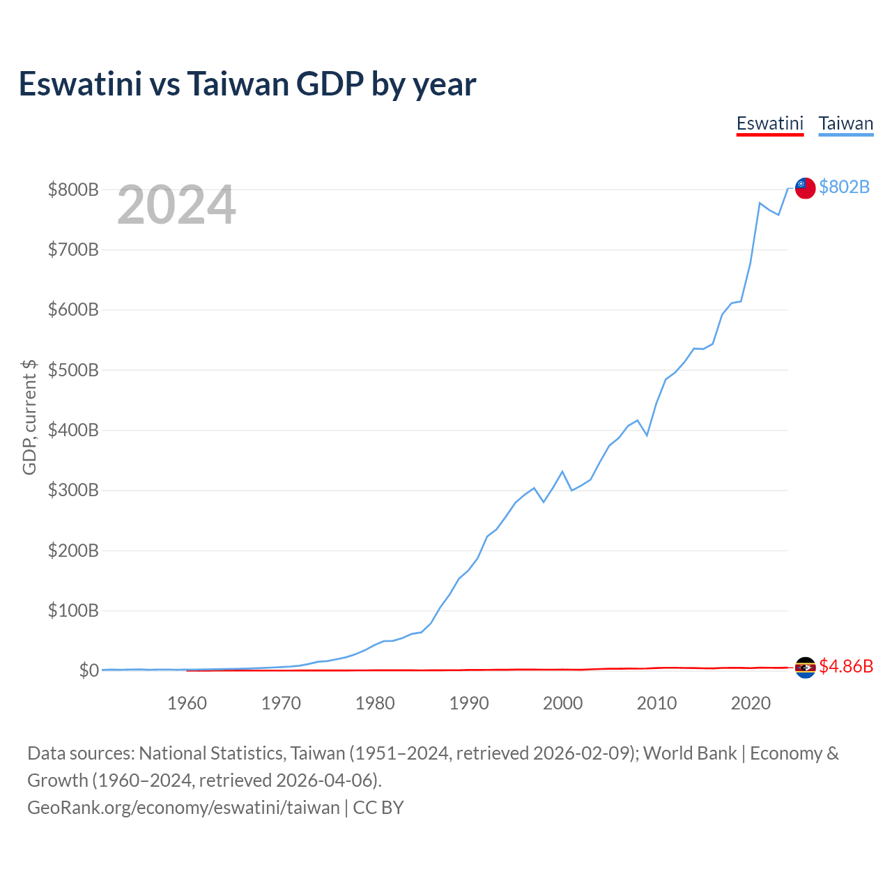 Eswatini has a GDP of $4.86B compared to $802B for Taiwan, ranking 162/197 and 22/197 by economy size, respectively.