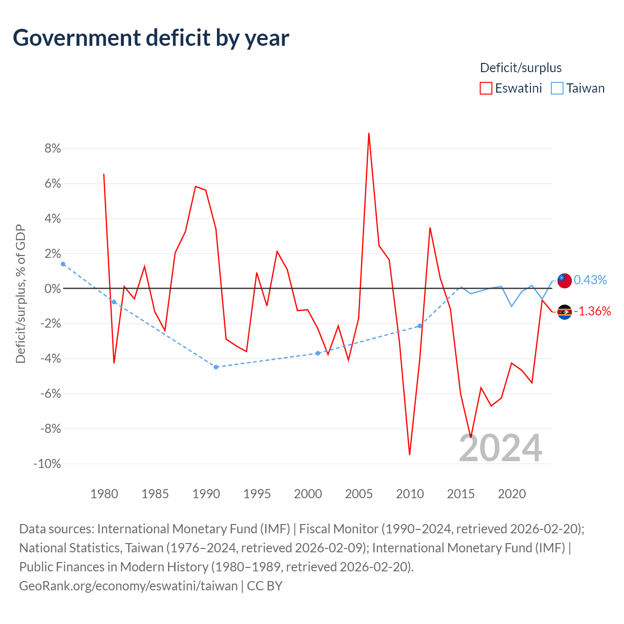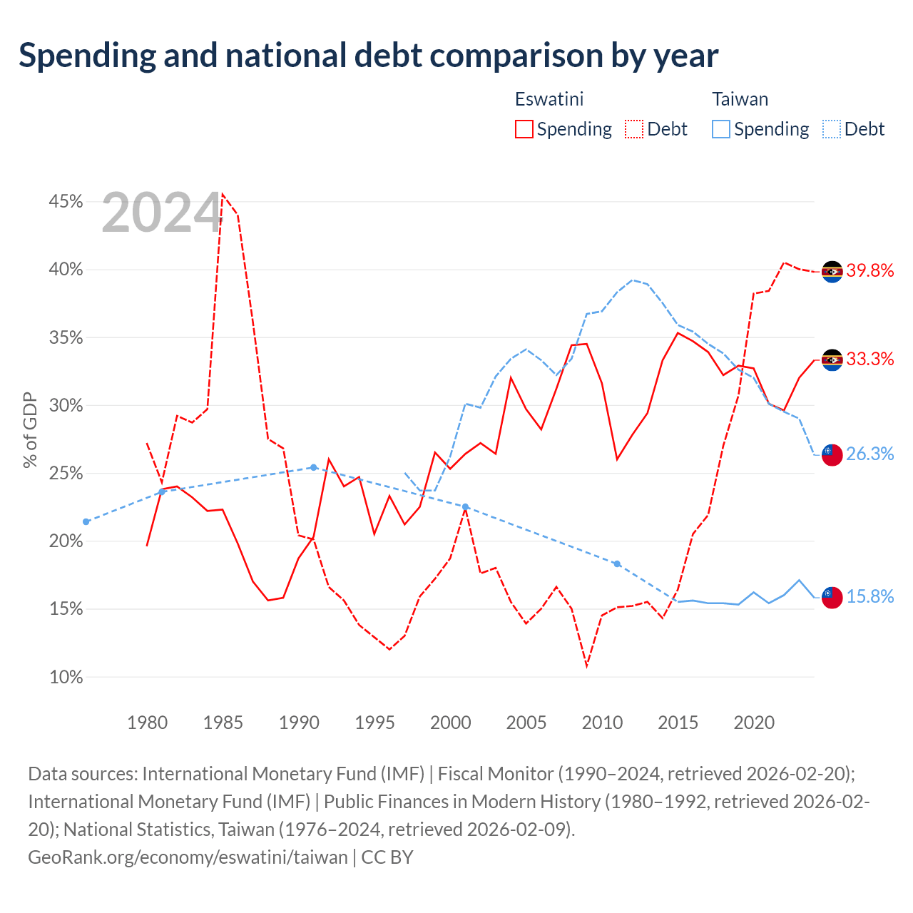 Eswatini has $1.93B in government debt (39.8% of GDP), compared to $211B (26.3% of GDP) in Taiwan.