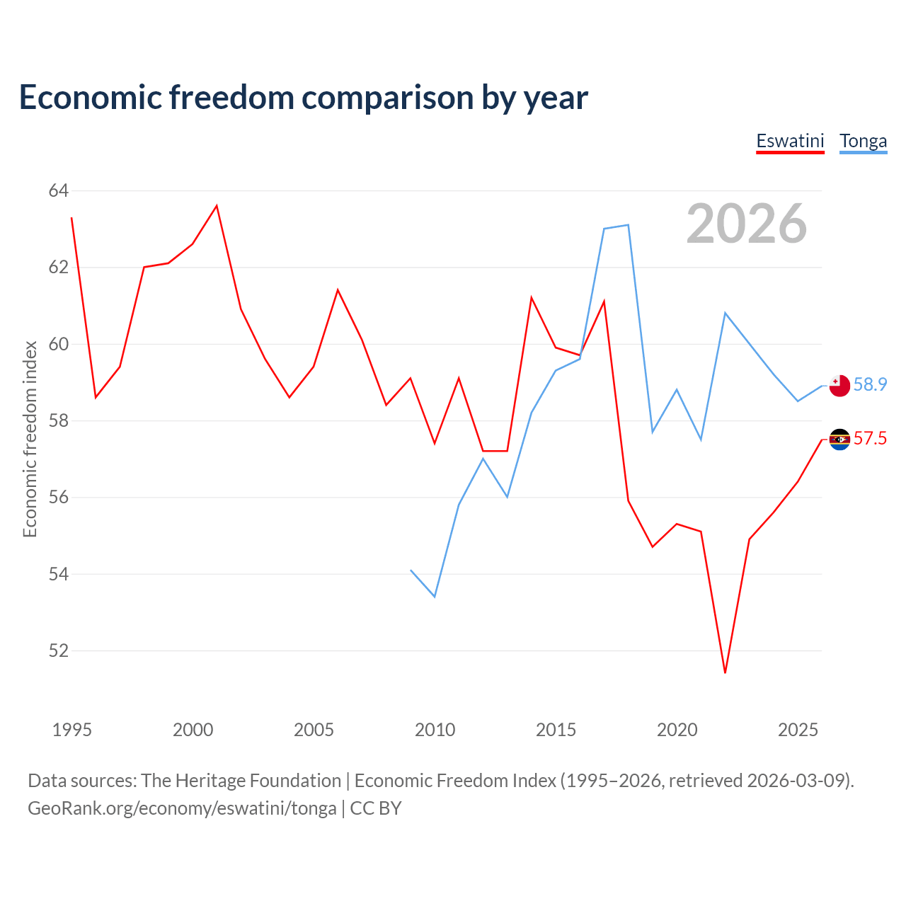 The Economic Freedom Index for Eswatini is 57.5, ranking 116/197, compared to 58.9 for Tonga, ranking 107/197. The chart above displays a comparison of annual changes in economic freedom indexes.