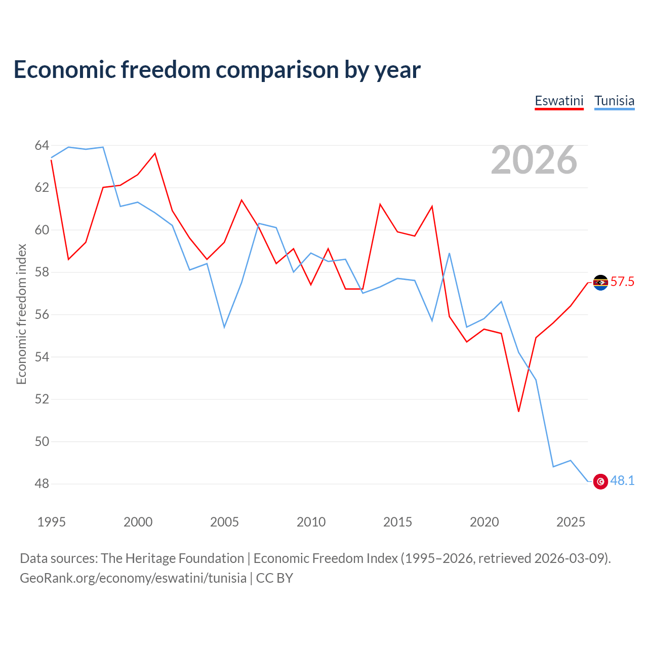 Data sources: The Heritage Foundation | Economic Freedom Index (1995–2026, retrieved 2026-03-09).