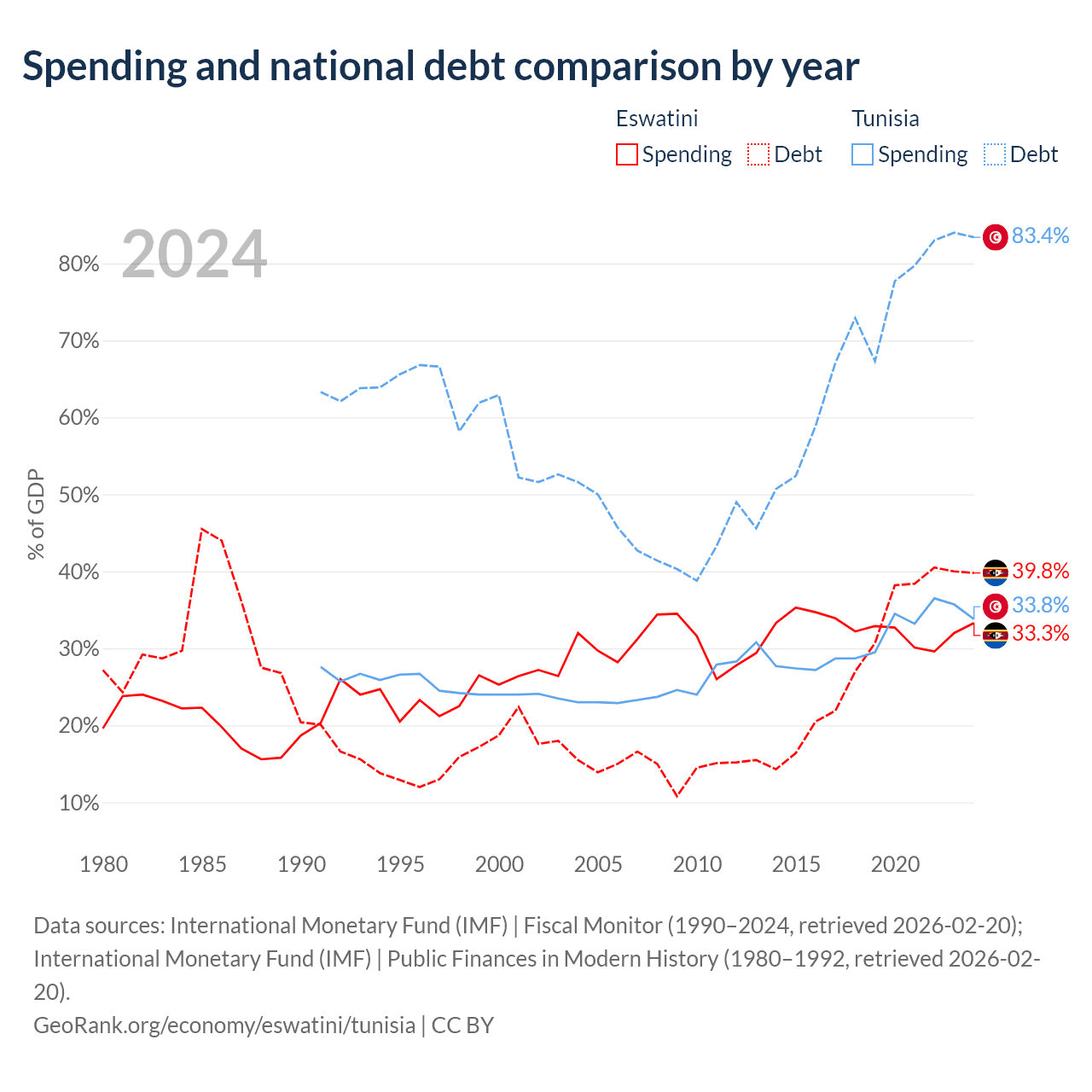Eswatini has $1.93B in government debt (39.8% of GDP), compared to $42.8B (83.4% of GDP) in Tunisia.