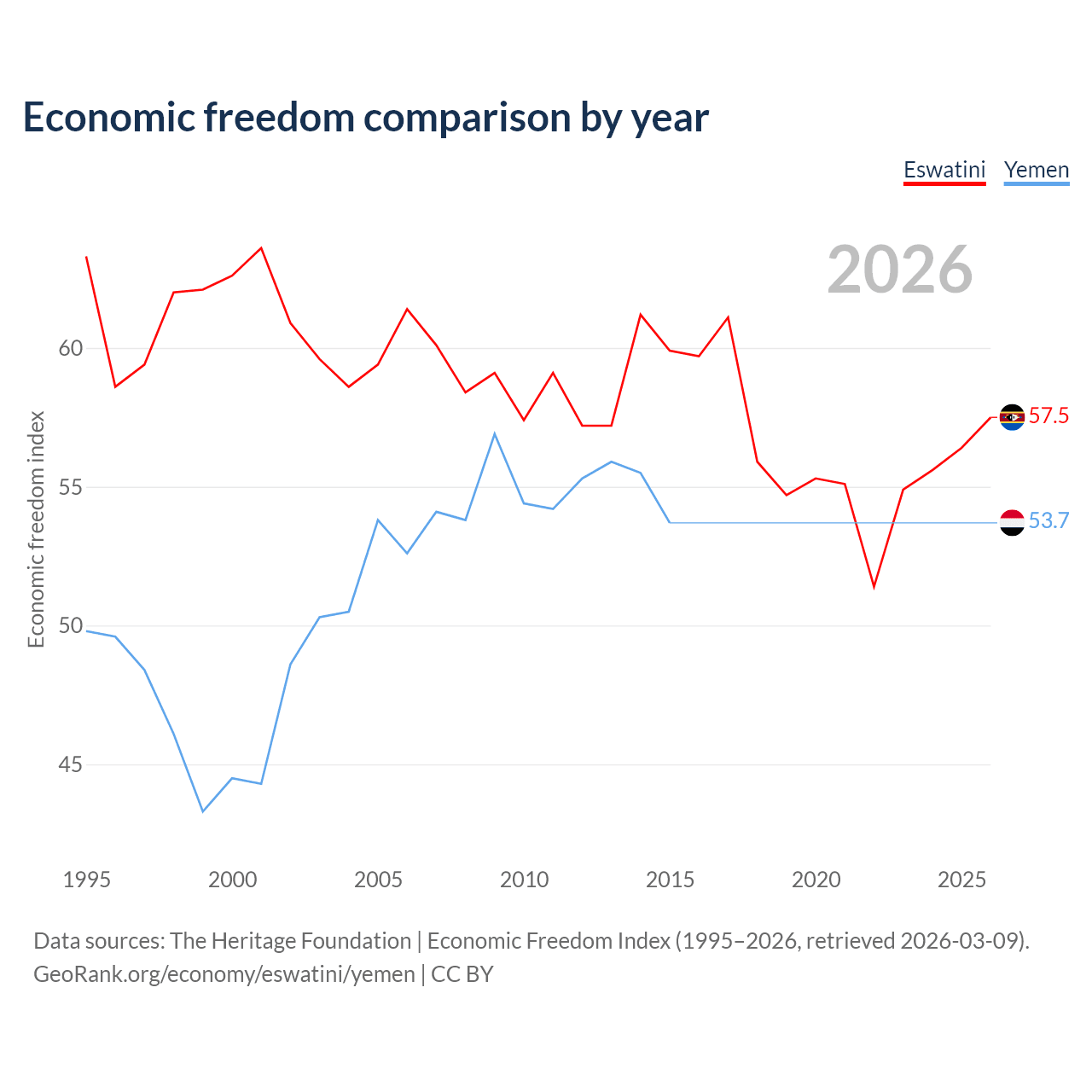 The Economic Freedom Index for Eswatini is 57.5, ranking 116/197, compared to 53.7 for Yemen, ranking 138/197. The chart above displays a comparison of annual changes in economic freedom indexes.