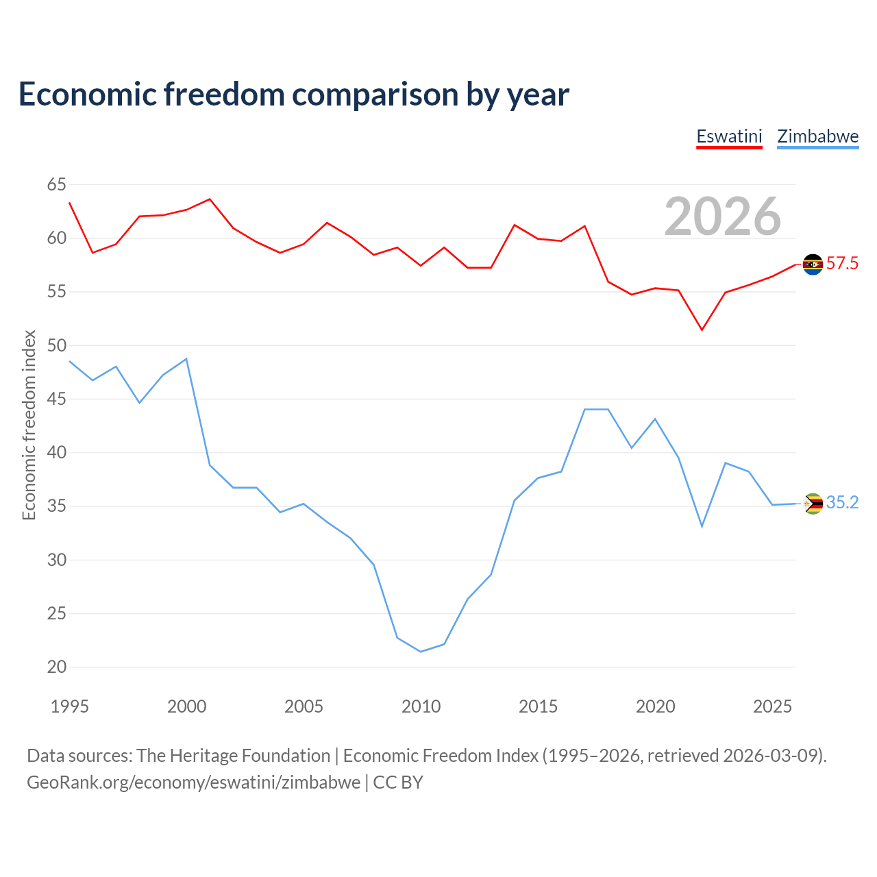 The Economic Freedom Index for Eswatini is 57.5, ranking 116/197, compared to 35.2 for Zimbabwe, ranking 190/197. The chart above displays a comparison of annual changes in economic freedom indexes.