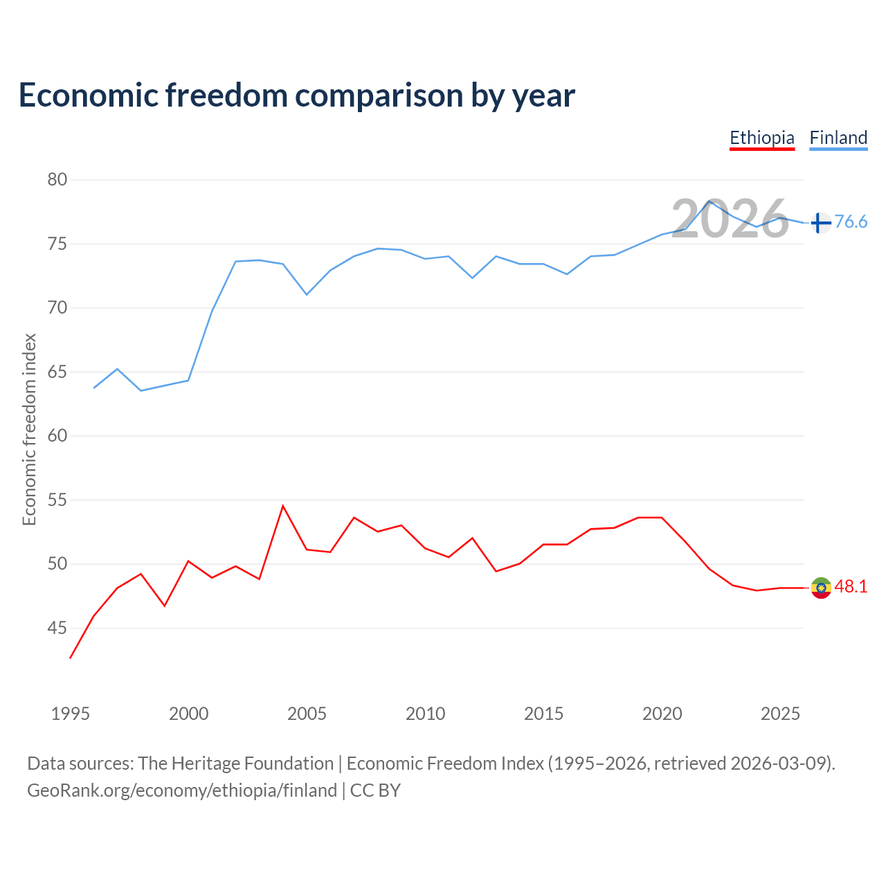 The Economic Freedom Index for Ethiopia is 48.1, ranking 171/197, compared to 76.6 for Finland, ranking 15/197. The chart above displays a comparison of annual changes in economic freedom indexes.