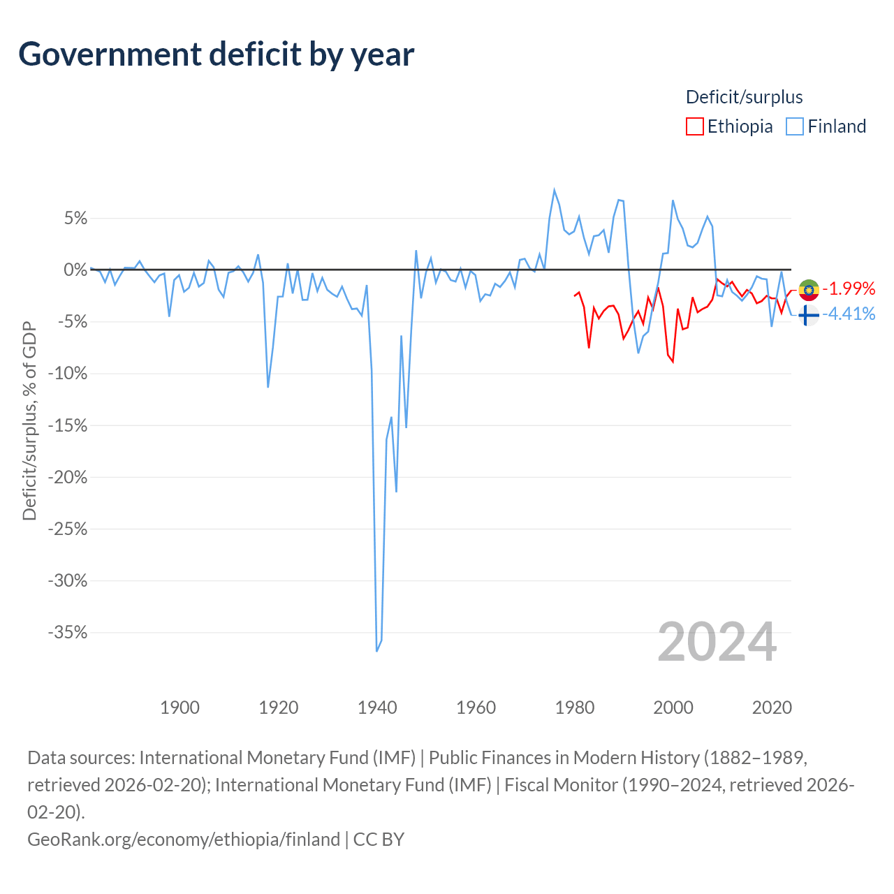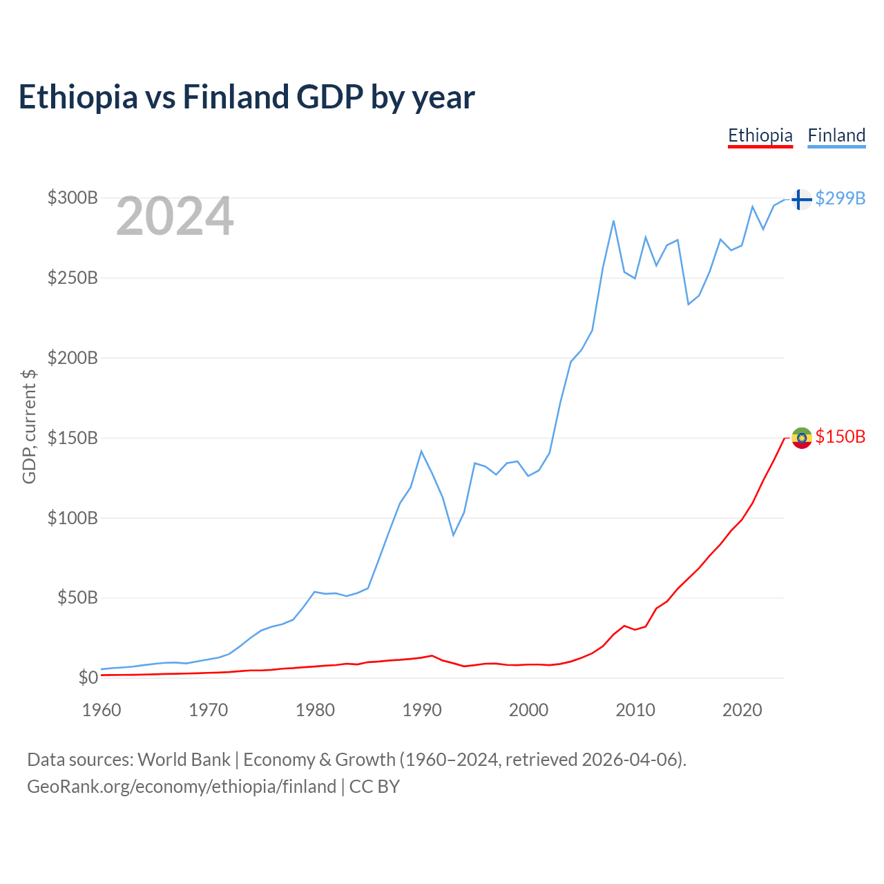 Ethiopia has a GDP of $150B compared to $299B for Finland, ranking 60/197 and 47/197 by economy size, respectively.