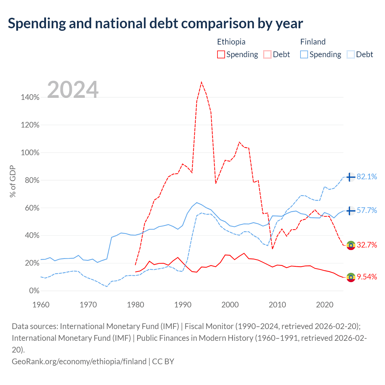 Ethiopia has $48.9B in government debt (32.7% of GDP), compared to $245B (82.1% of GDP) in Finland.