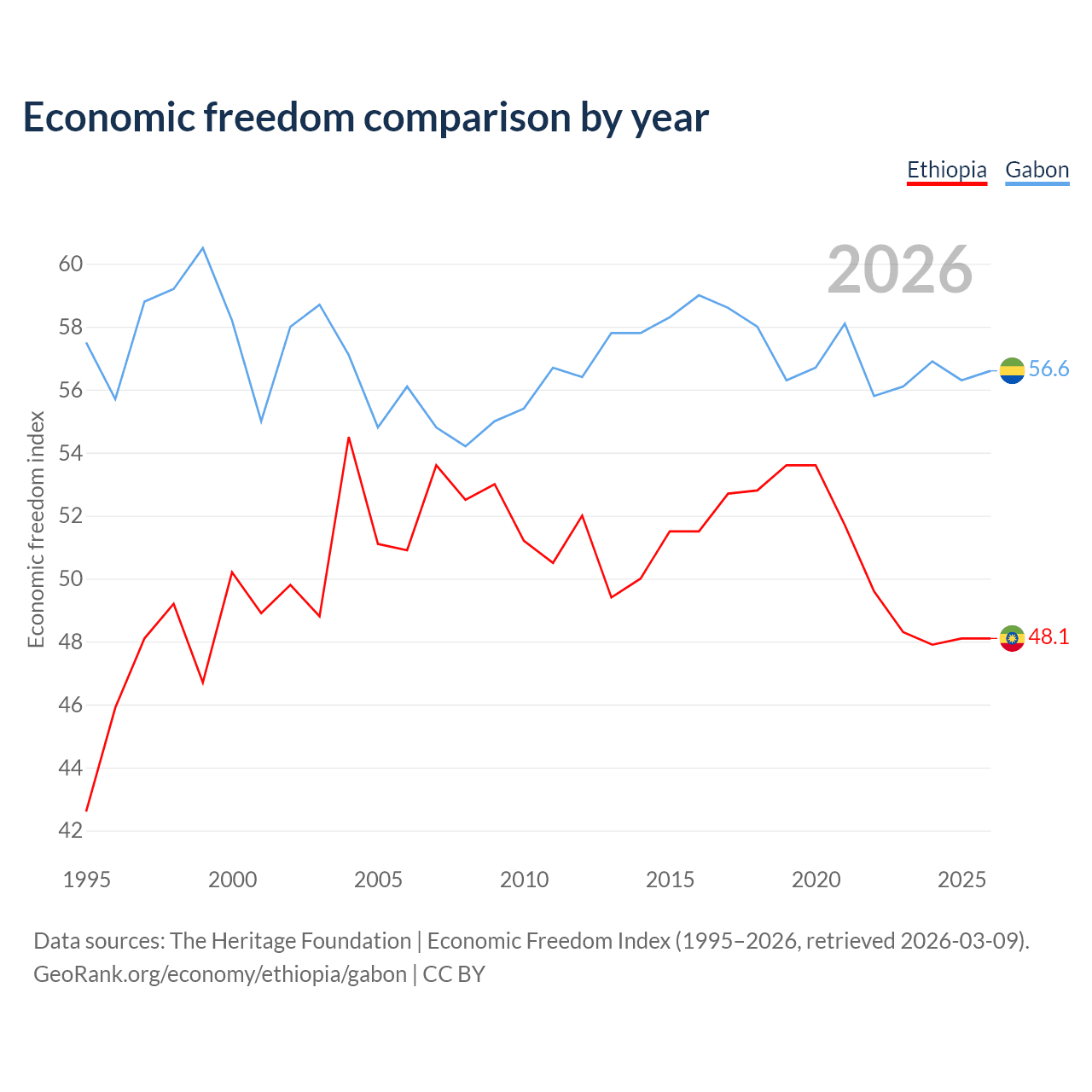 The Economic Freedom Index for Ethiopia is 48.1, ranking 171/197, compared to 56.6 for Gabon, ranking 120/197. The chart above displays a comparison of annual changes in economic freedom indexes.