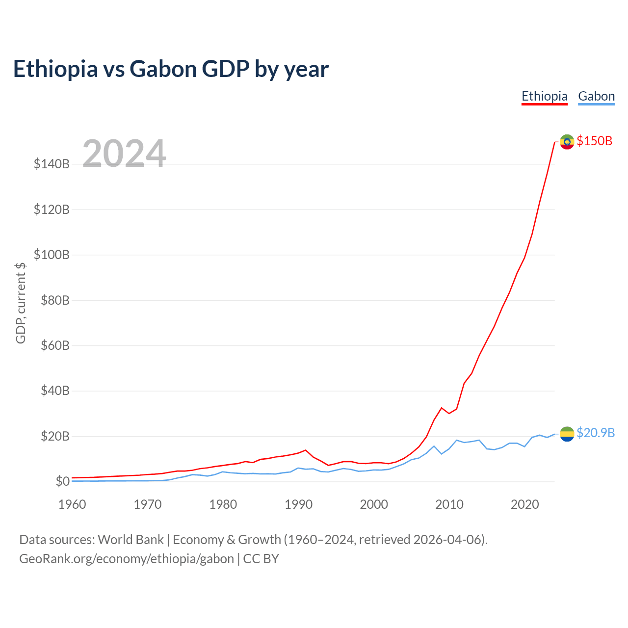 Ethiopia has a GDP of $150B compared to $20.9B for Gabon, ranking 60/197 and 127/197 by economy size, respectively.