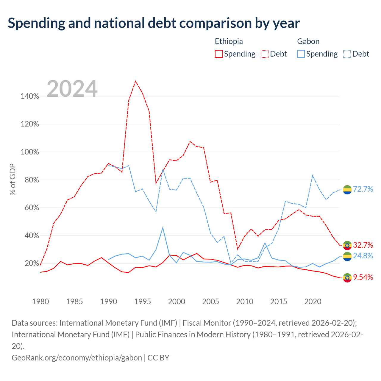 Ethiopia has $48.9B in government debt (32.7% of GDP), compared to $15.2B (72.7% of GDP) in Gabon.