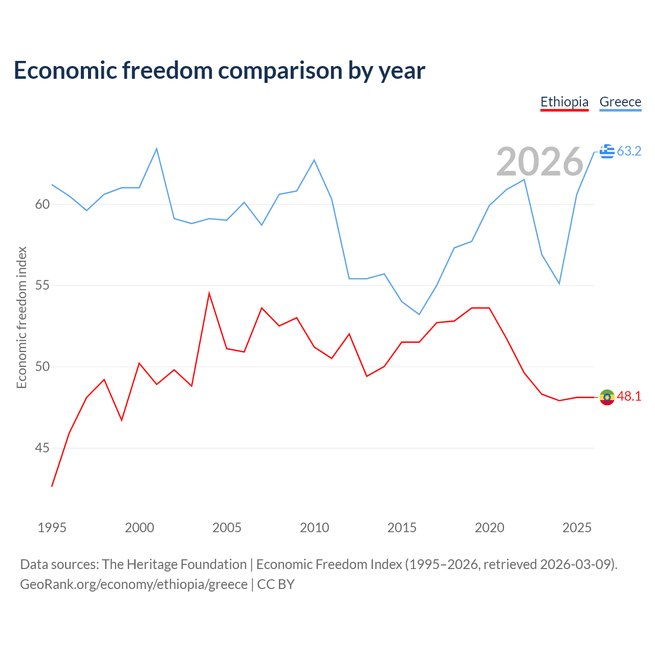 The Economic Freedom Index for Ethiopia is 48.1, ranking 171/197, compared to 63.2 for Greece, ranking 82/197. The chart above displays a comparison of annual changes in economic freedom indexes.