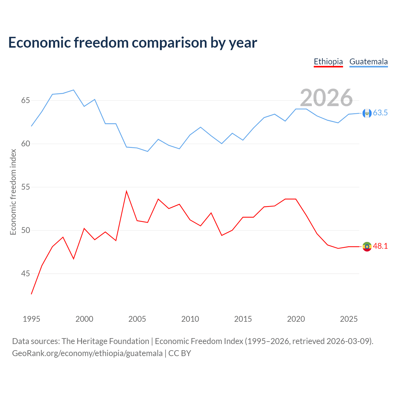 The Economic Freedom Index for Ethiopia is 48.1, ranking 171/197, compared to 63.5 for Guatemala, ranking 79/197. The chart above displays a comparison of annual changes in economic freedom indexes.