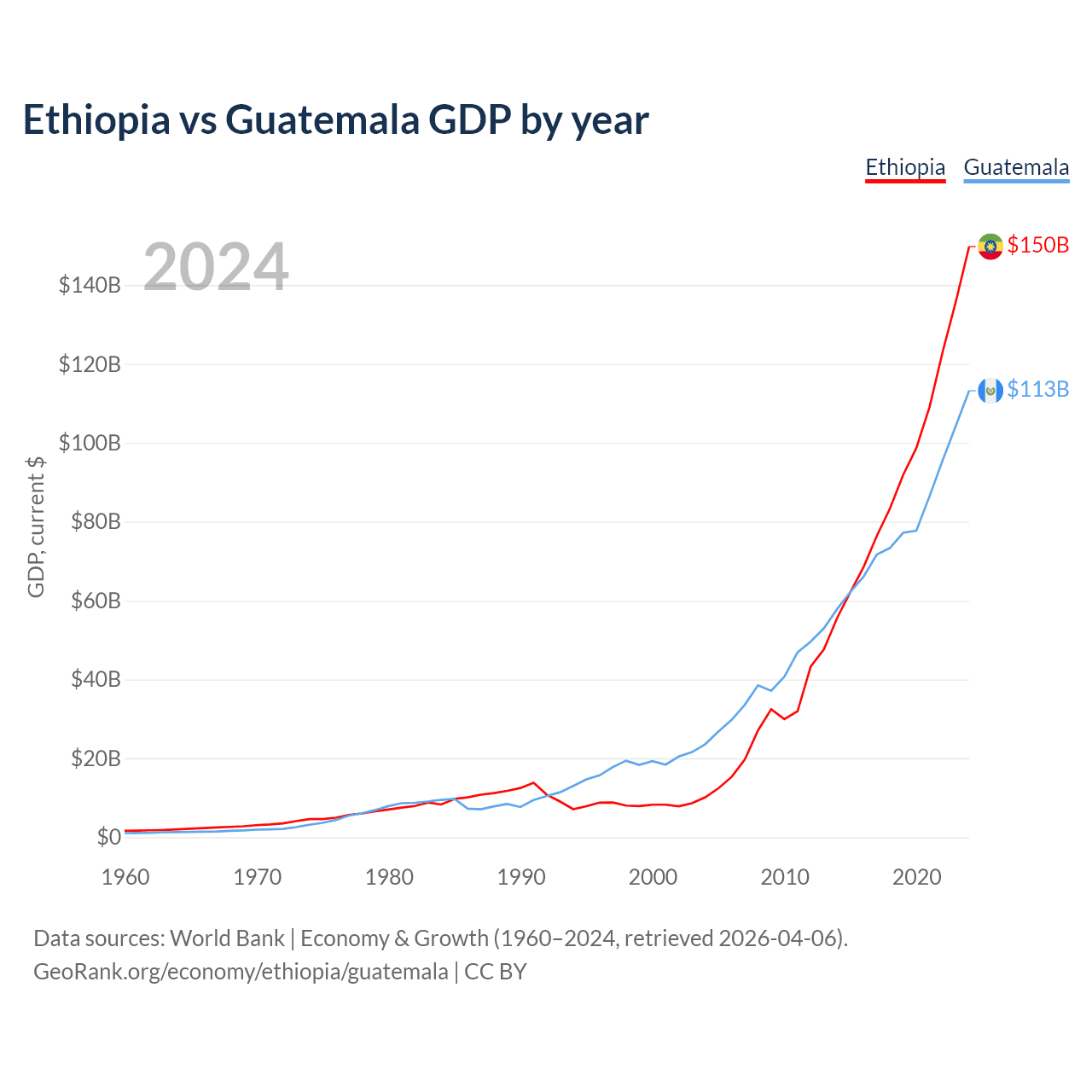 Ethiopia has a GDP of $150B compared to $113B for Guatemala, ranking 60/197 and 68/197 by economy size, respectively.