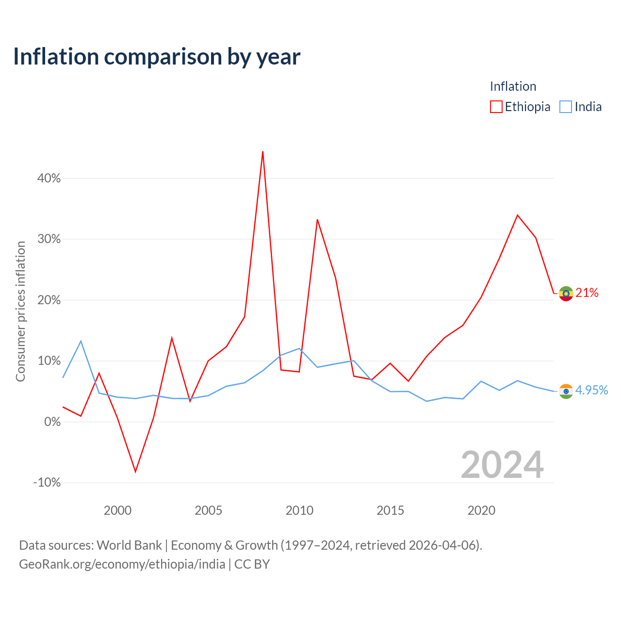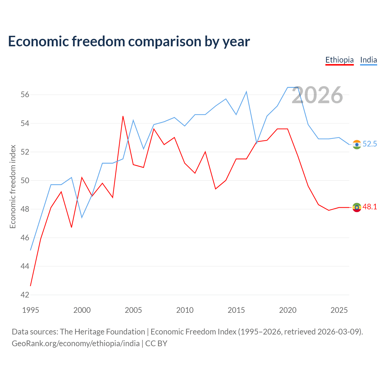 The Economic Freedom Index for Ethiopia is 48.1, ranking 171/197, compared to 52.5 for India, ranking 146/197. The chart above displays a comparison of annual changes in economic freedom indexes.