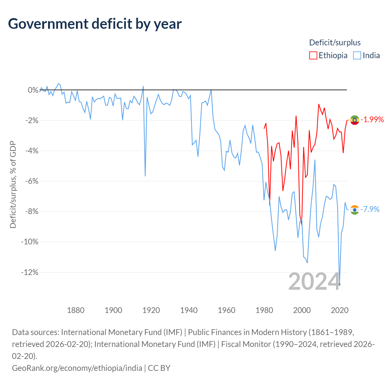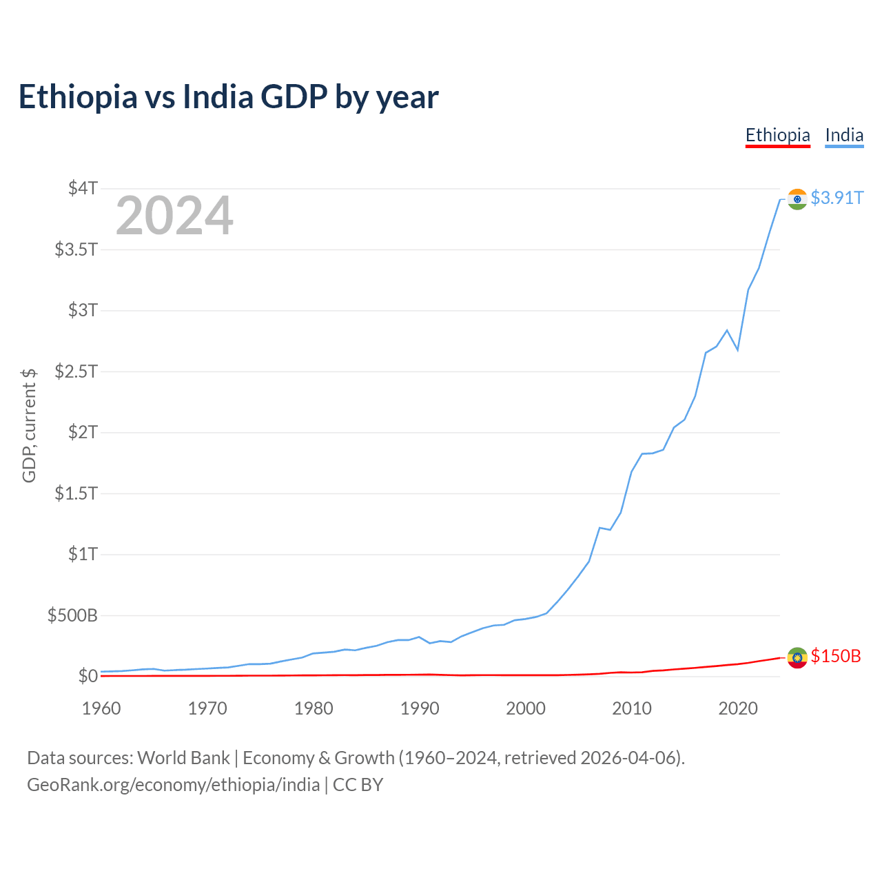 Ethiopia has a GDP of $150B compared to $3.91T for India, ranking 60/197 and 5/197 by economy size, respectively.