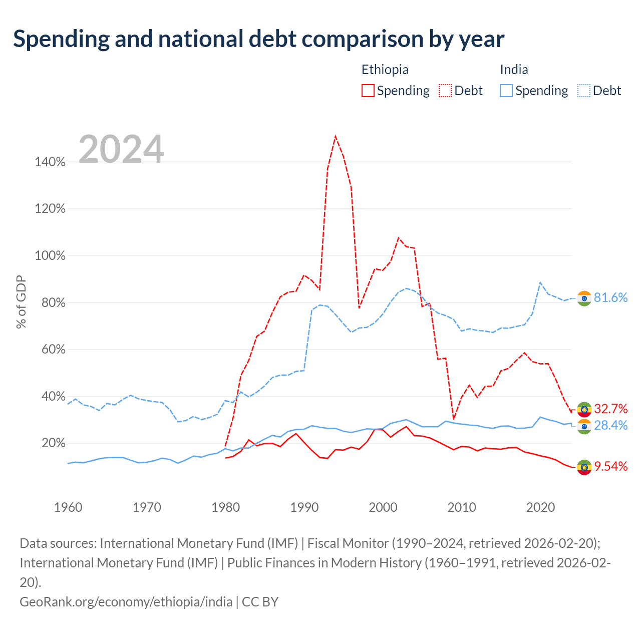 Ethiopia has $48.9B in government debt (32.7% of GDP), compared to $3.19T (81.6% of GDP) in India.