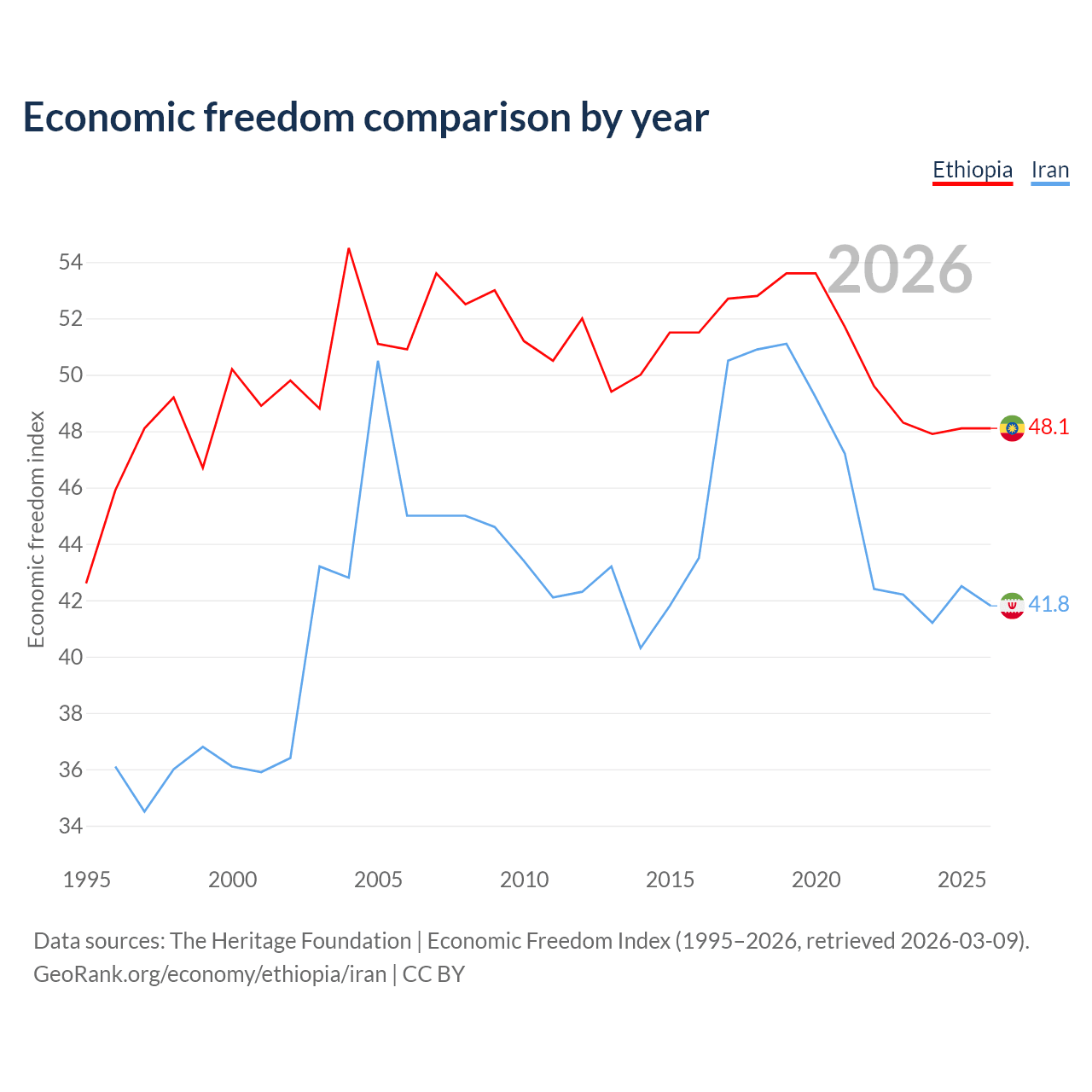 The Economic Freedom Index for Ethiopia is 48.1, ranking 171/197, compared to 41.8 for Iran, ranking 185/197. The chart above displays a comparison of annual changes in economic freedom indexes.