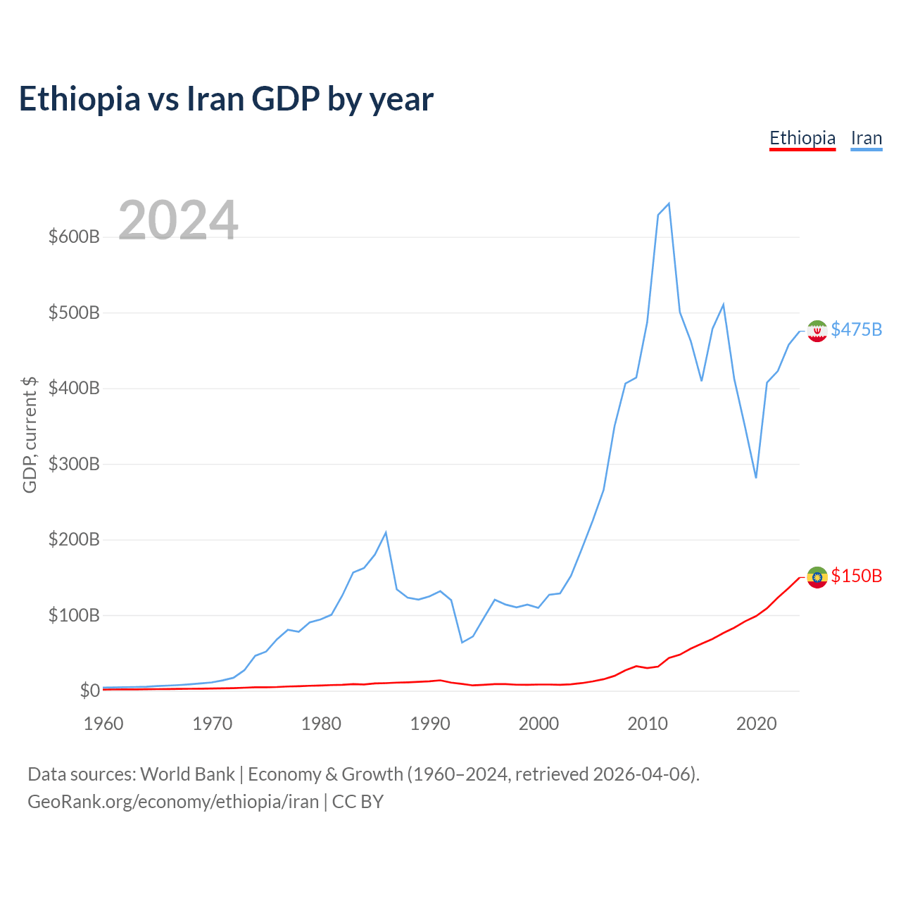 Ethiopia has a GDP of $150B compared to $475B for Iran, ranking 60/197 and 34/197 by economy size, respectively.
