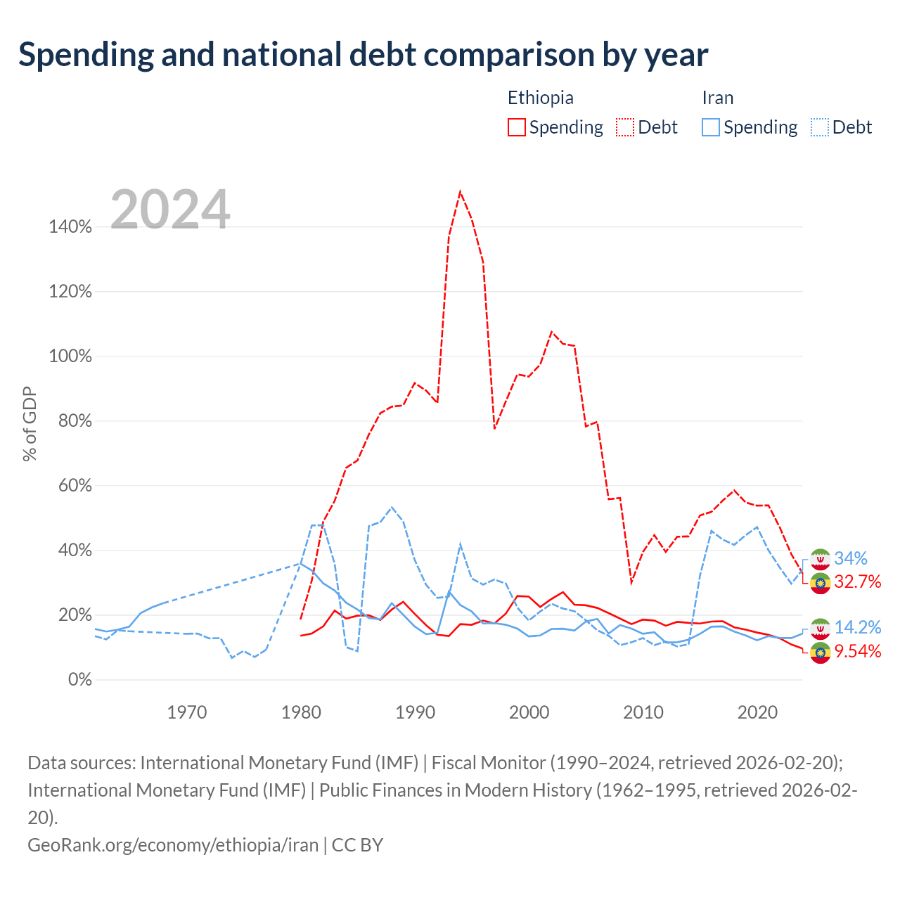 Ethiopia has $48.9B in government debt (32.7% of GDP), compared to $162B (34% of GDP) in Iran.