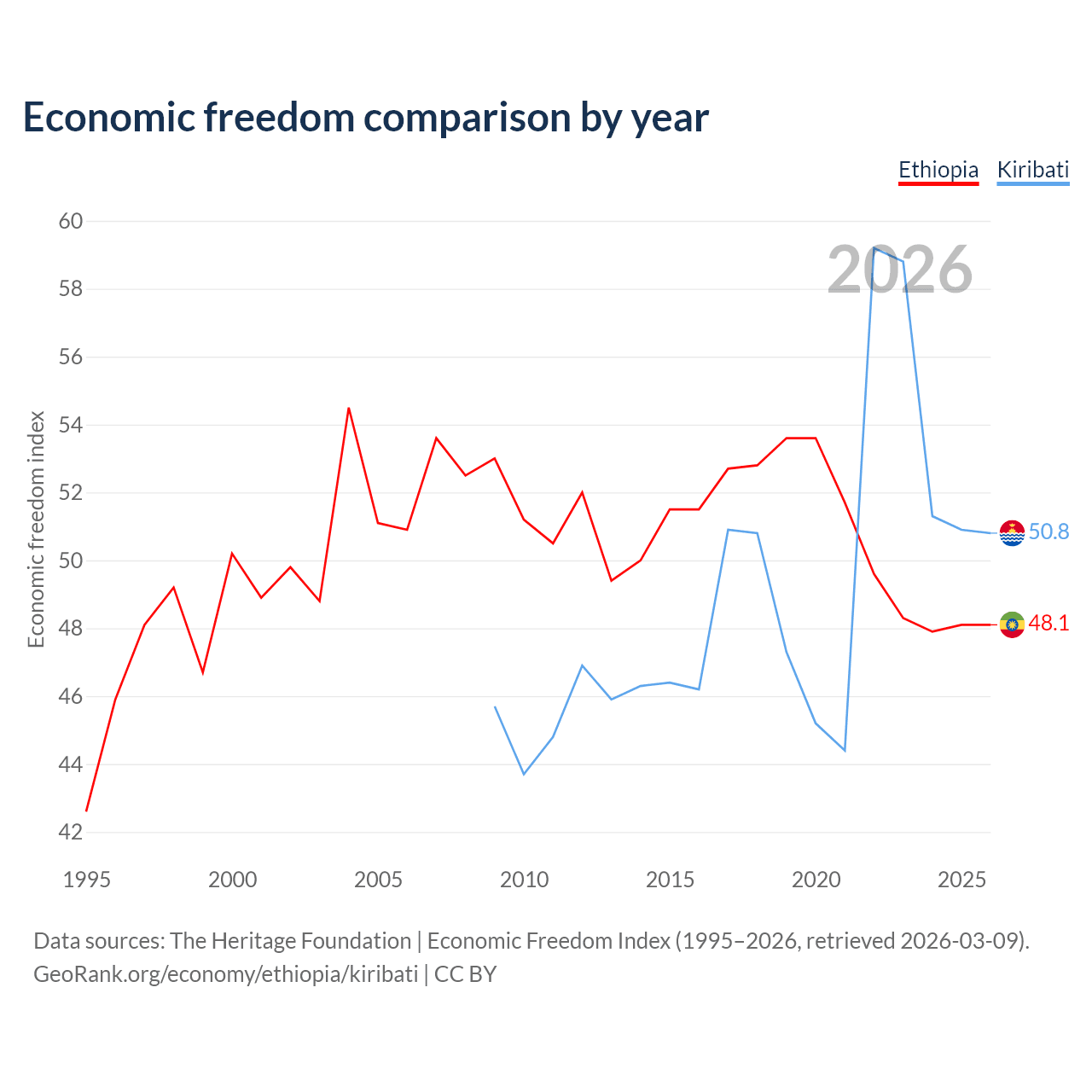 The Economic Freedom Index for Ethiopia is 48.1, ranking 171/197, compared to 50.8 for Kiribati, ranking 158/197. The chart above displays a comparison of annual changes in economic freedom indexes.