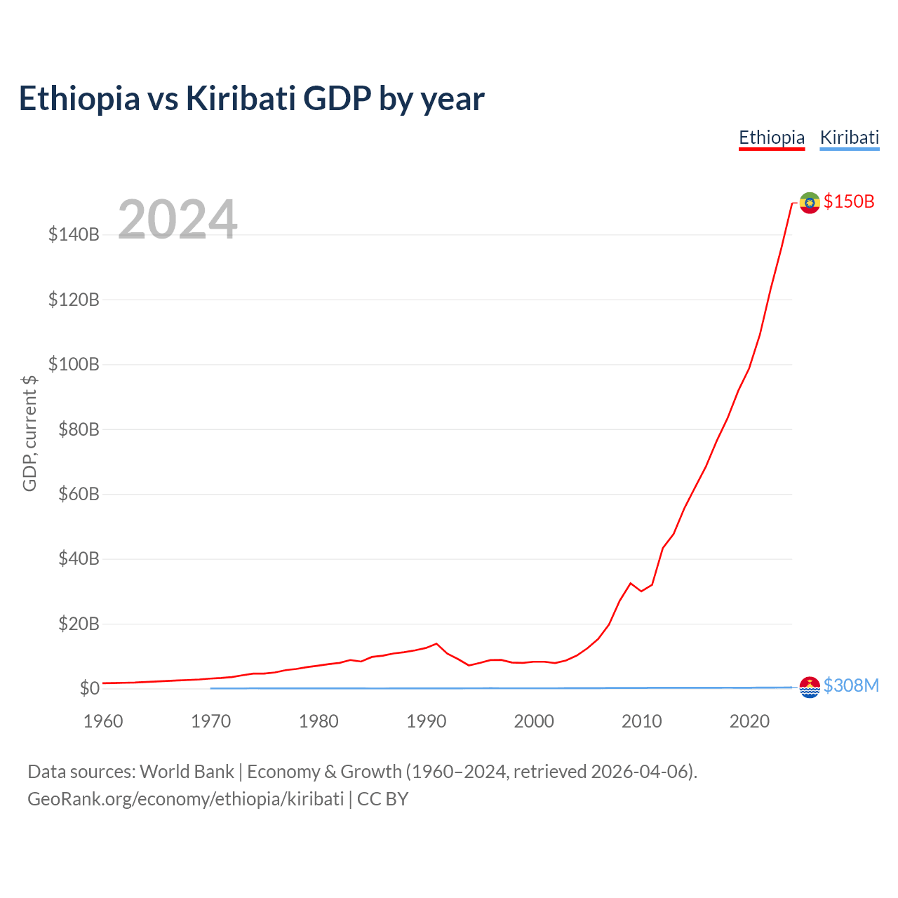 Ethiopia has a GDP of $150B compared to $308M for Kiribati, ranking 60/197 and 192/197 by economy size, respectively.