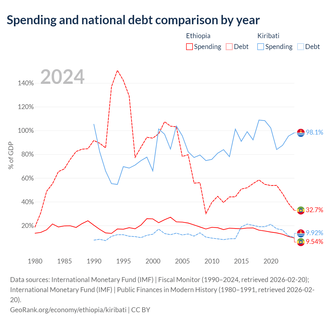Ethiopia has $48.9B in government debt (32.7% of GDP), compared to $30.5M (9.92% of GDP) in Kiribati.