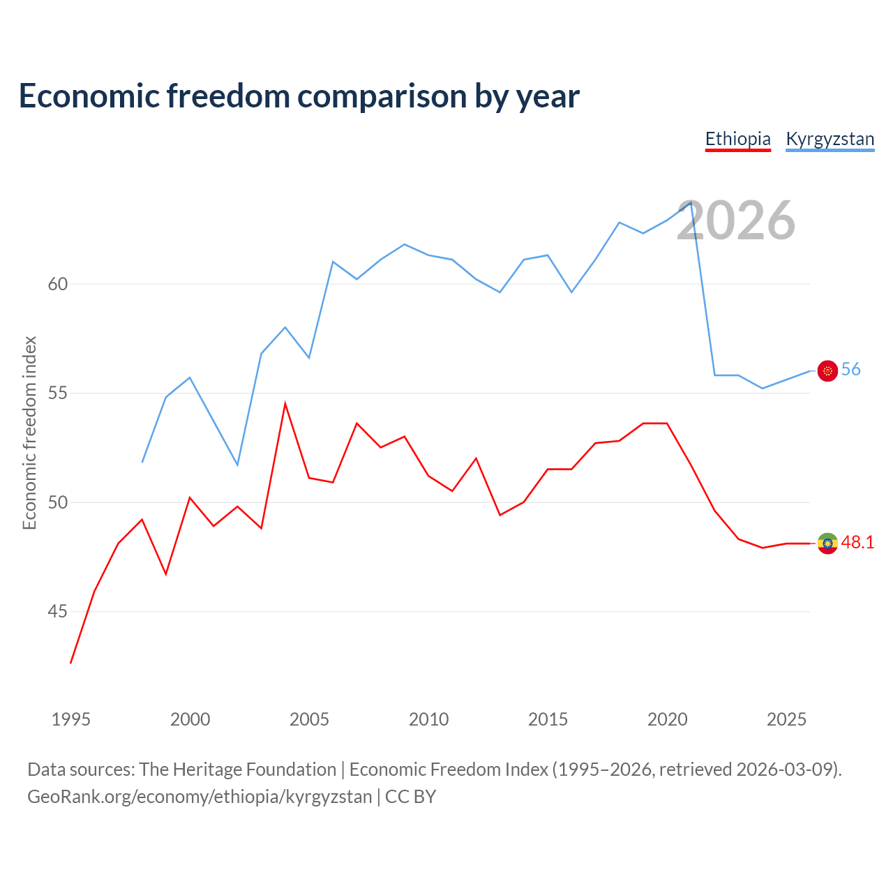 The Economic Freedom Index for Ethiopia is 48.1, ranking 171/197, compared to 56 for Kyrgyzstan, ranking 126/197. The chart above displays a comparison of annual changes in economic freedom indexes.