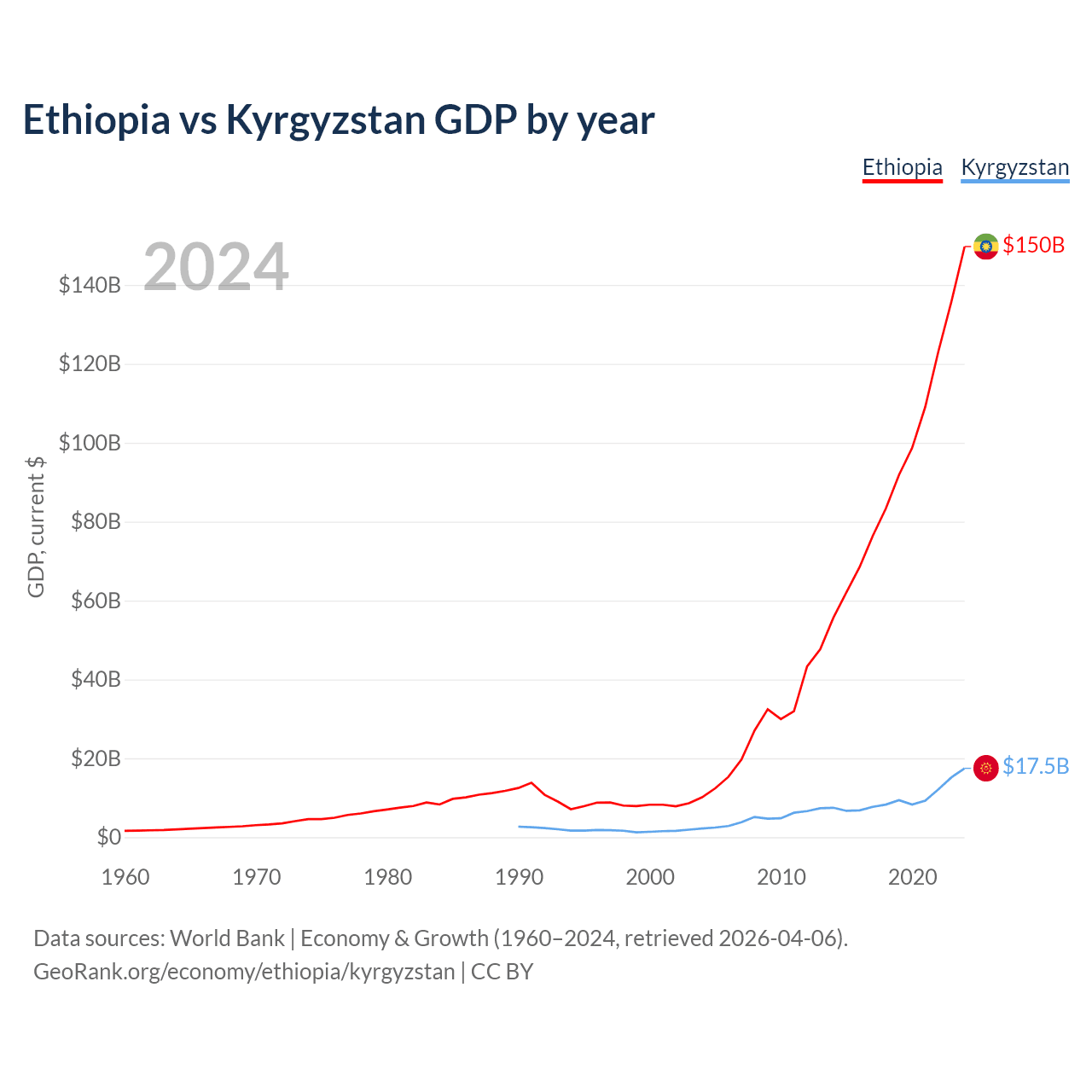 Ethiopia has a GDP of $150B compared to $17.5B for Kyrgyzstan, ranking 60/197 and 135/197 by economy size, respectively.