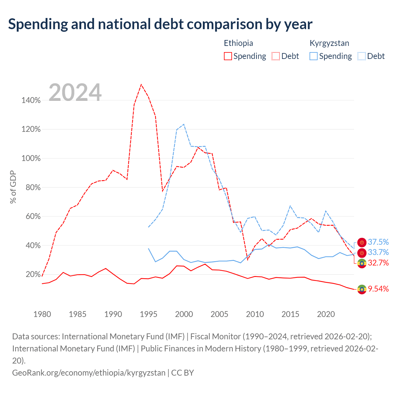 Ethiopia has $48.9B in government debt (32.7% of GDP), compared to $6.56B (37.5% of GDP) in Kyrgyzstan.