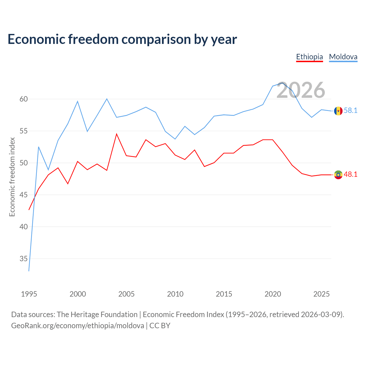 The Economic Freedom Index for Ethiopia is 48.1, ranking 171/197, compared to 58.1 for Moldova, ranking 112/197. The chart above displays a comparison of annual changes in economic freedom indexes.