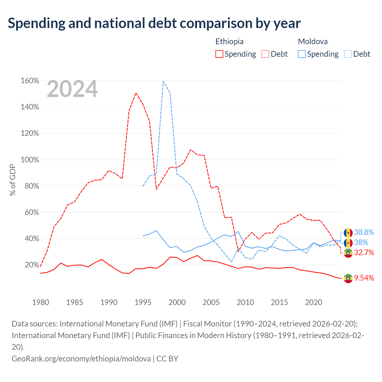 Ethiopia has $48.9B in government debt (32.7% of GDP), compared to $7.06B (38.8% of GDP) in Moldova.