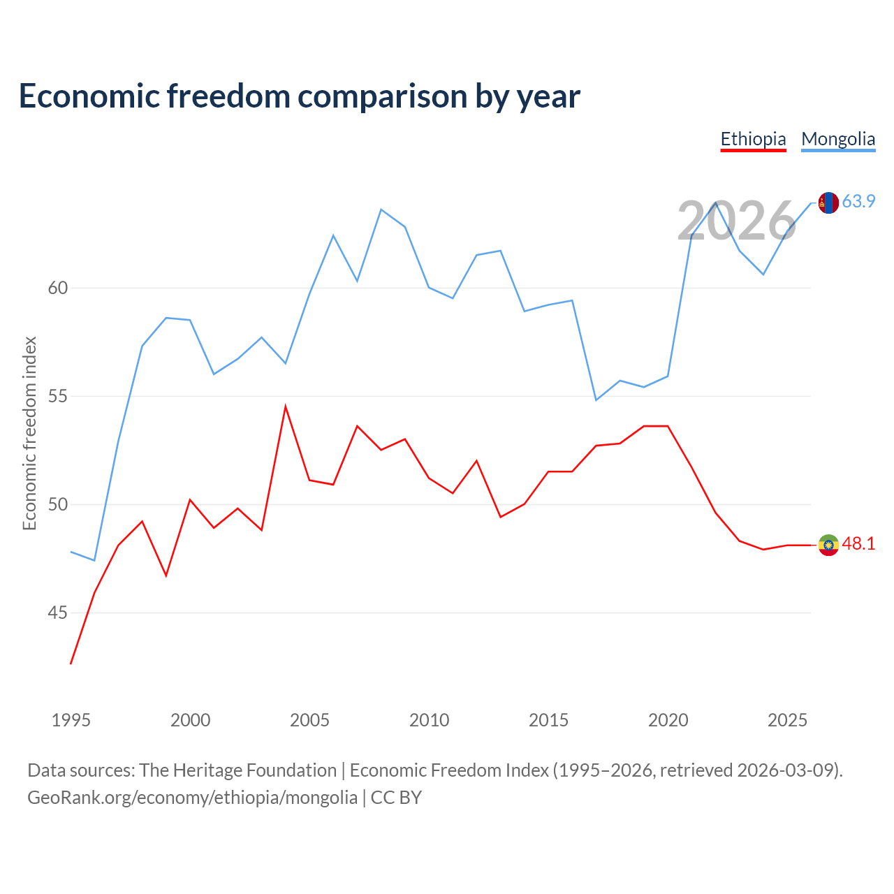The Economic Freedom Index for Ethiopia is 48.1, ranking 171/197, compared to 63.9 for Mongolia, ranking 76/197. The chart above displays a comparison of annual changes in economic freedom indexes.